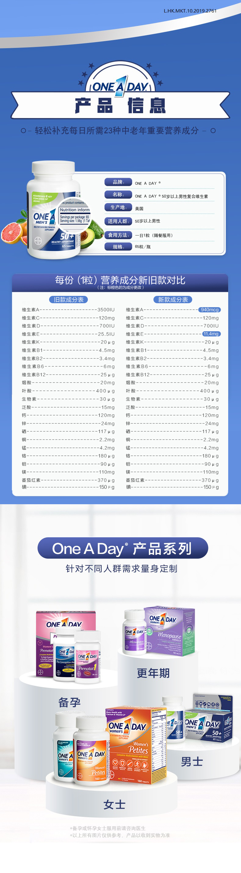 美国销量第一的复合维生素品牌One A Day ,此款专为50岁以上男性定制,轻松补充21种营养素,提升身体免疫力,提供每天所需维生素营养成分,强化骨骼功能,提高新陈代谢,优化营养吸收。