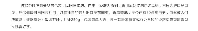 这款凤山铁观音主要是为了回归传统、自主、经济为原则,使用独有的无烟灶烘焙工艺精制而成,烘焙花香,醇厚甘爽,由全国茶叶标准化技术委员会的高级评茶师监制,使用8道复杂工艺,24道传统制茶准则制作,坚持正炒工艺,专为居家待客和办公自饮设计。