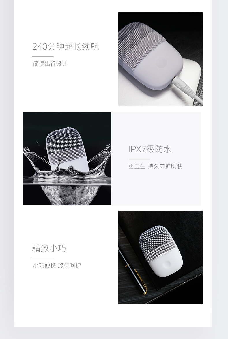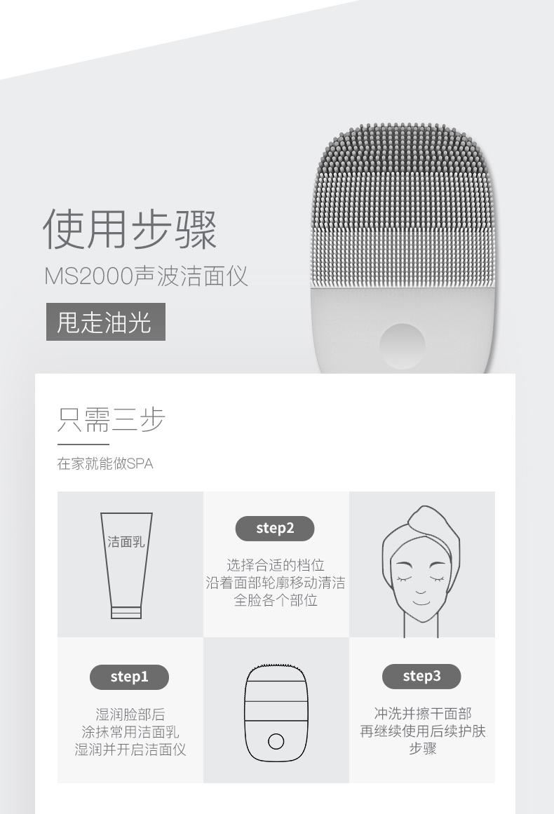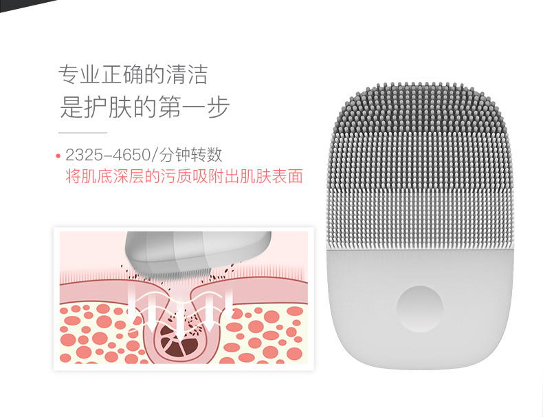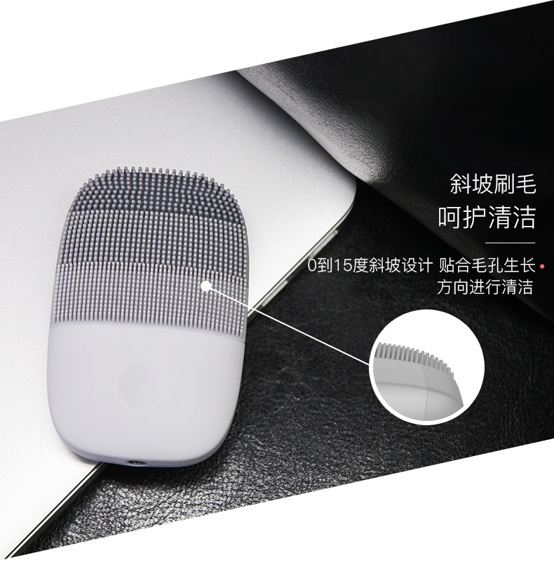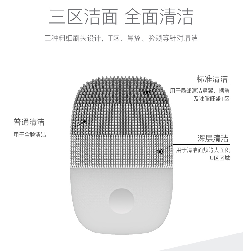 道康宁食品级硅胶刷毛,加厚硅胶延长触点。15度角刷毛,贴合毛孔生长角度。三种震动强度,应对不同肤质。整机IPX7级防水,根据刷毛的粗细分出三个区域,由上而下分别为精准清洁区、普通清洁区和深层清洁区,可以无死角清洁肌肤。刷头较大的可以用来清洁T区容易出油的地方,刷头较小的清洁脸颊,最细的用来清洁黑头。