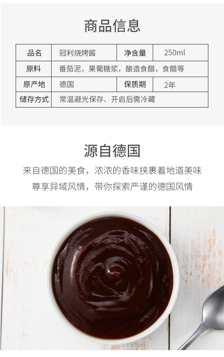 这款冠利调味酱,德国原产,用新鲜原料制作地道的西式风味,可用作烧烤酱料,肉类腌制蘸酱,牛排海鲜调味等等。