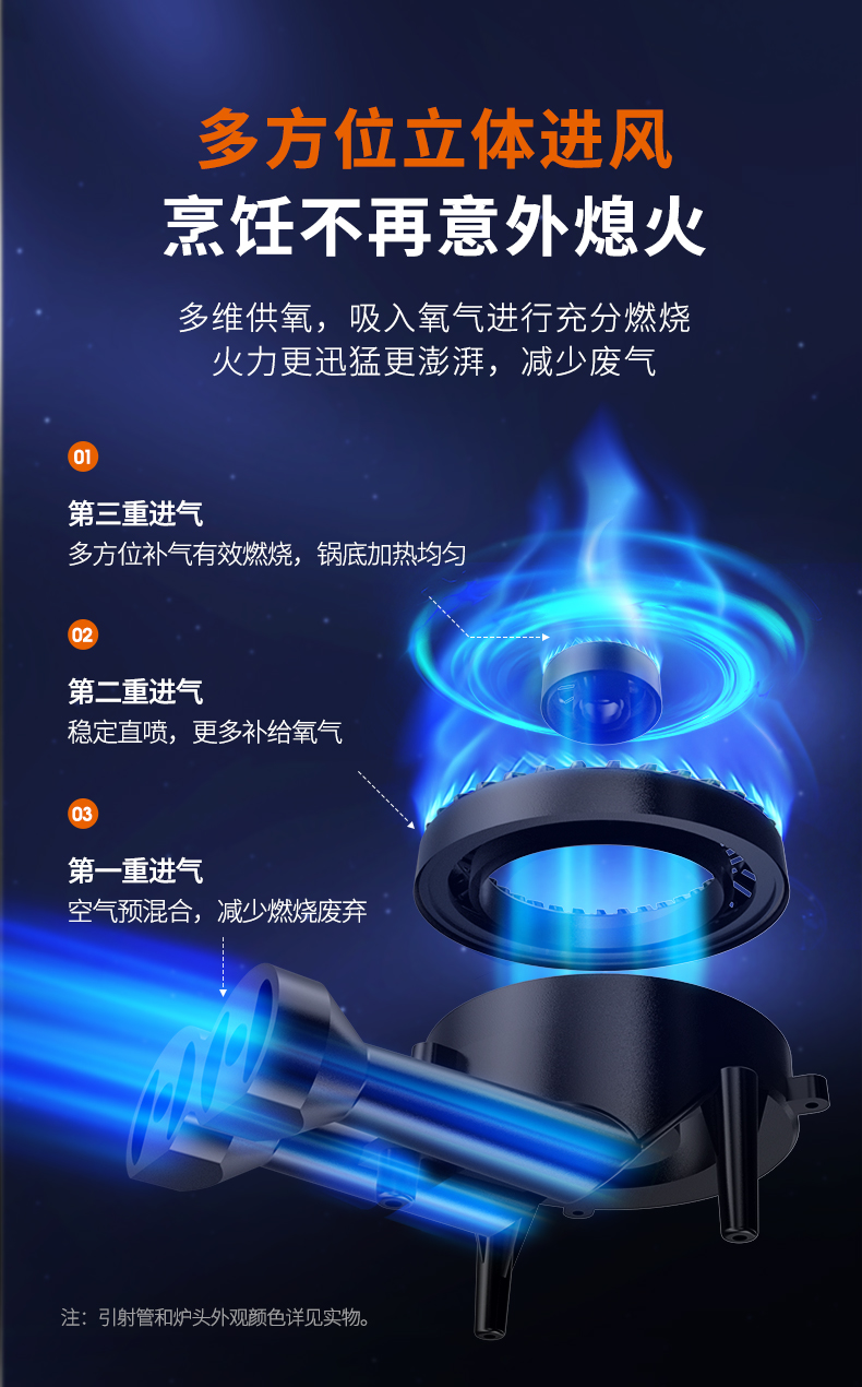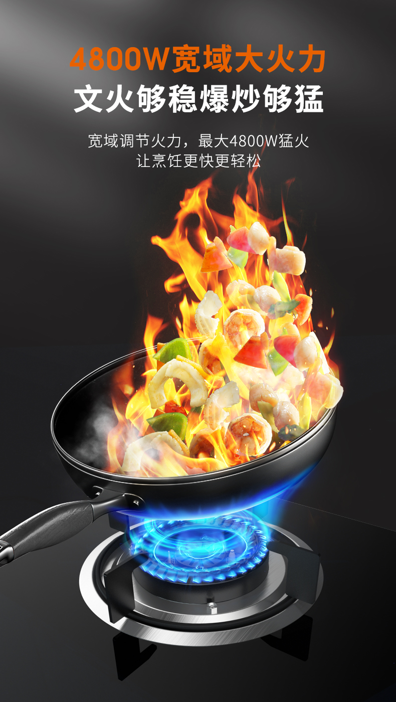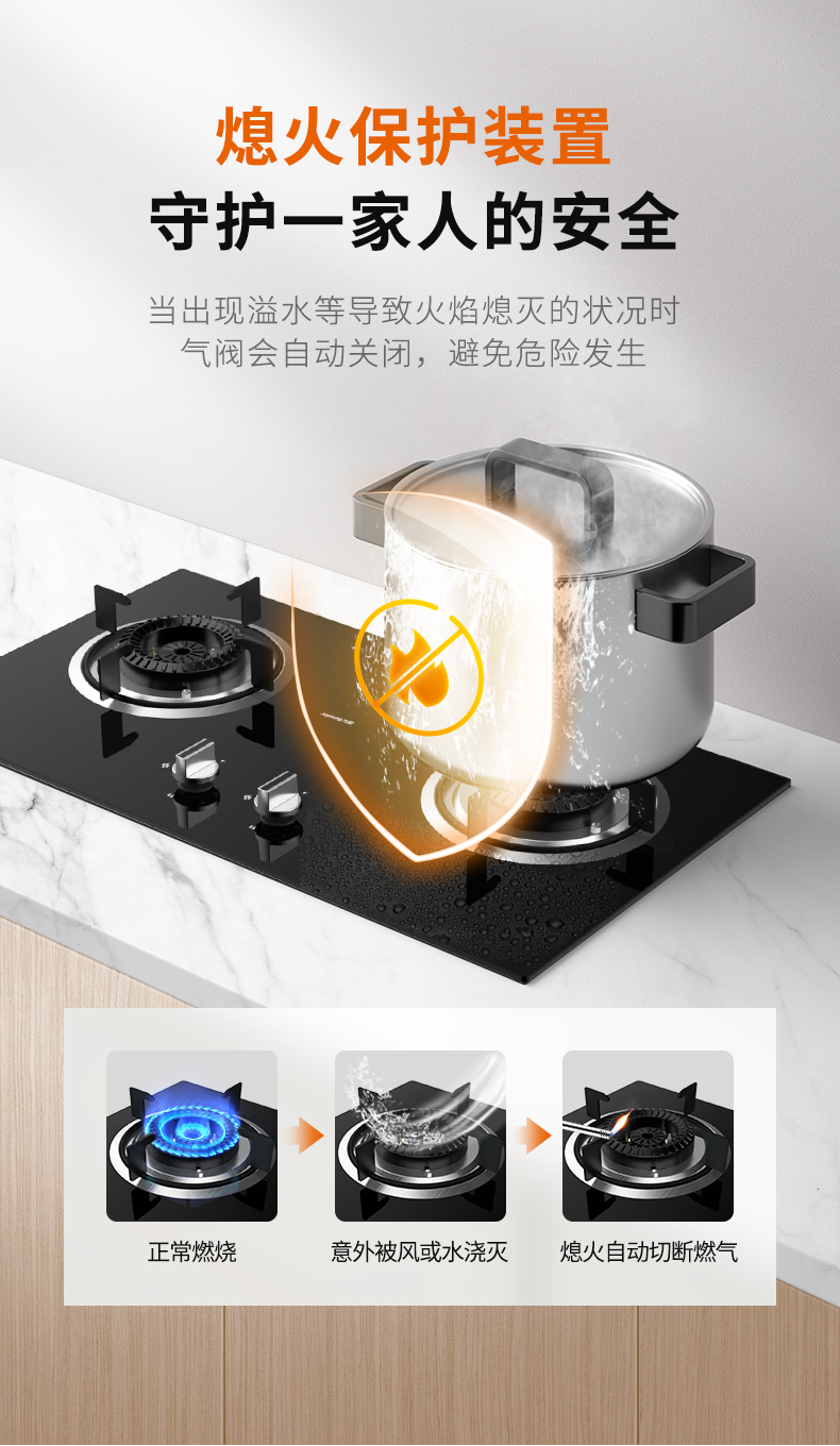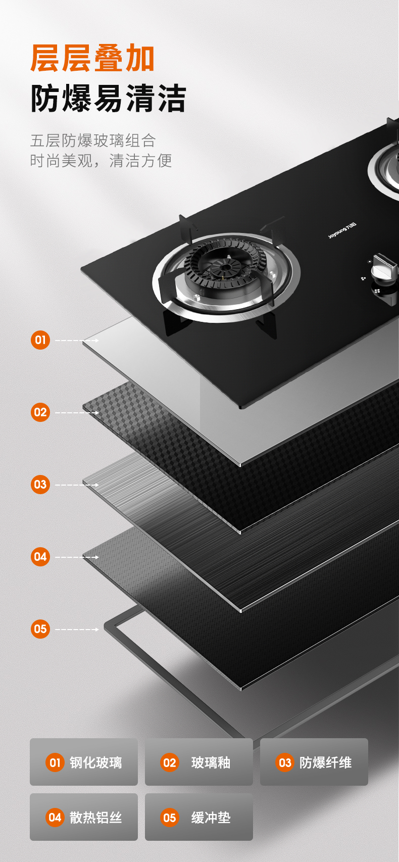 炉灶整体采用钢化玻璃+防爆油墨层+防爆膜,三层防爆防裂,耐腐蚀易清洁。采用猛火均喷燃烧系统,火力更稳更强,均匀加热无盲区,热效率高。精细的火力调节系统,火控精准。采用热敏感探头时刻检测燃烧状态,熄火自动切断燃气,避免安全隐患,使用更安全。