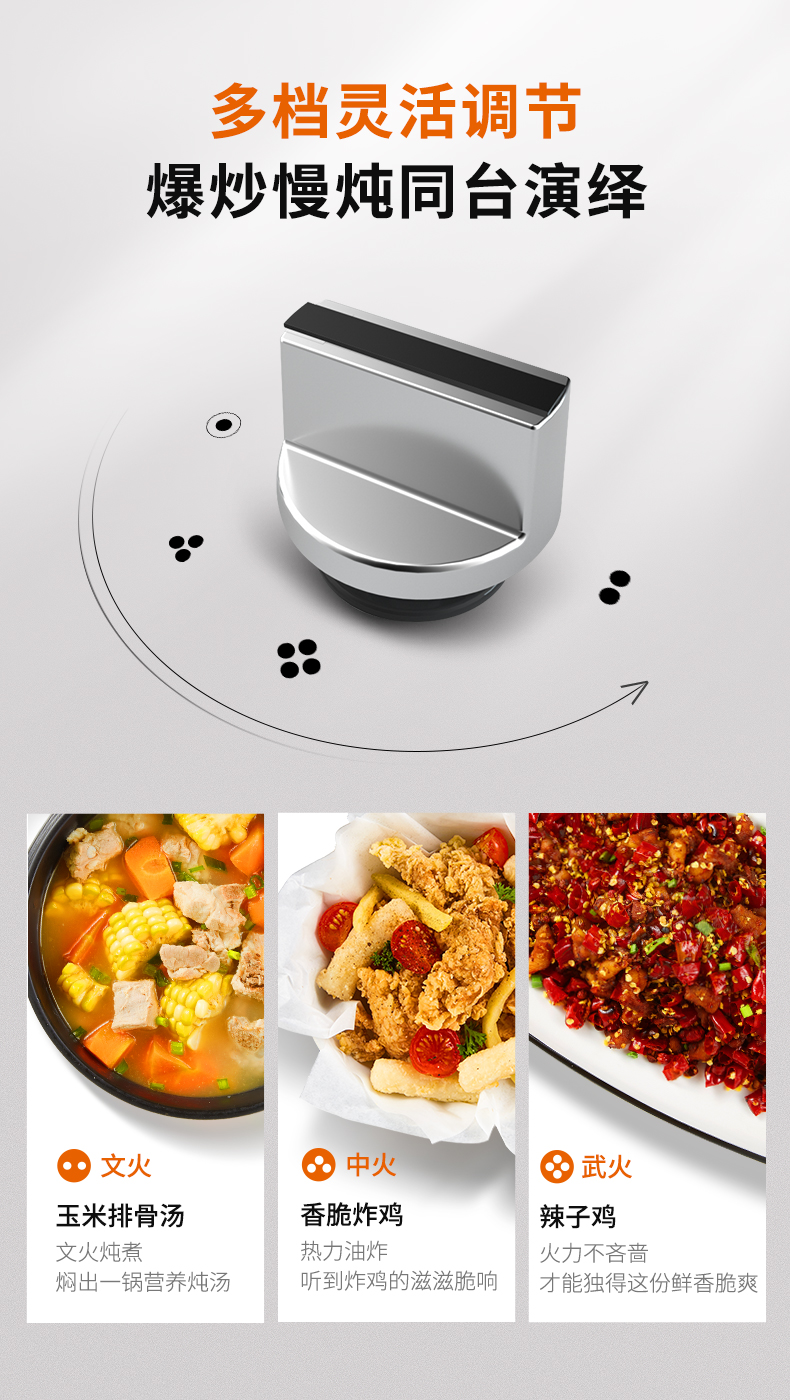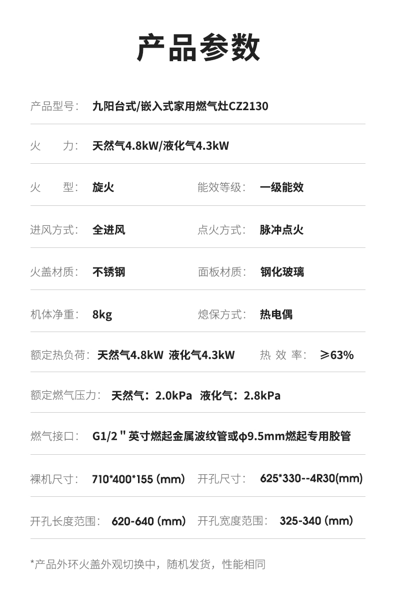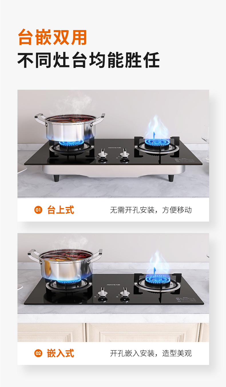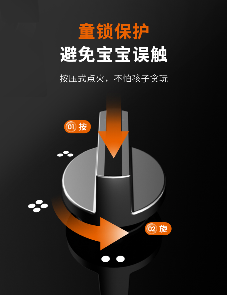 炉灶整体采用钢化玻璃+防爆油墨层+防爆膜,三层防爆防裂,耐腐蚀易清洁。采用猛火均喷燃烧系统,火力更稳更强,均匀加热无盲区,热效率高。精细的火力调节系统,火控精准。采用热敏感探头时刻检测燃烧状态,熄火自动切断燃气,避免安全隐患,使用更安全。