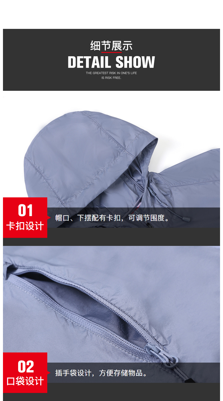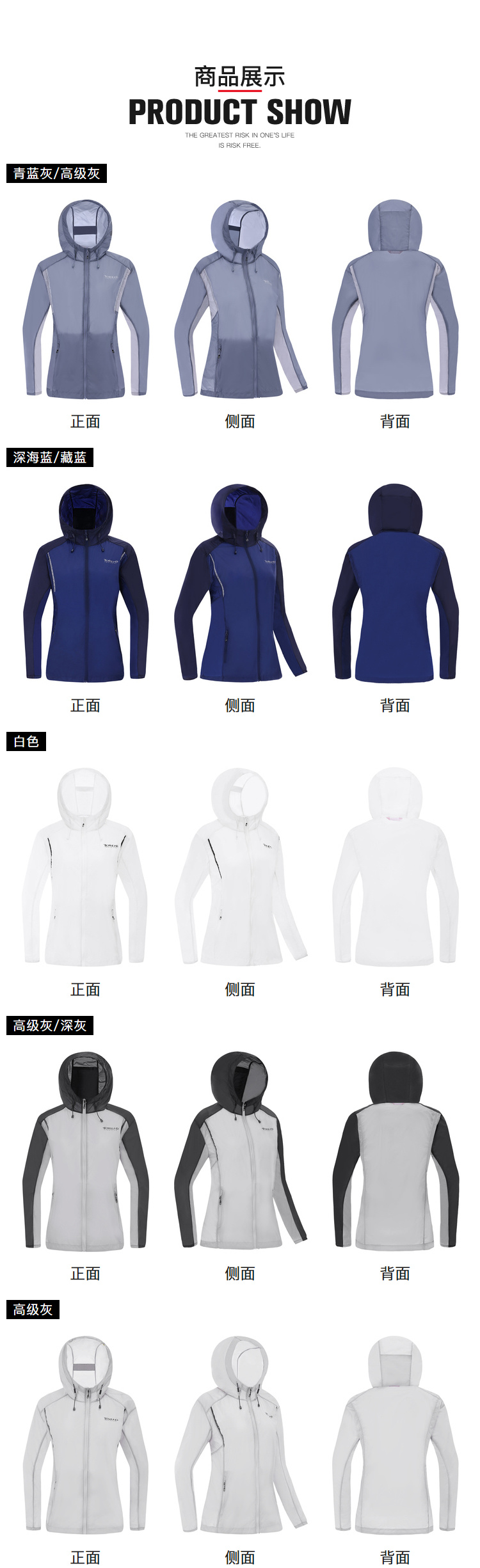 在款式上,修身版型,一体连帽设计,3D立体剪裁,使风帽更加贴合头型;松紧袖口,弹力松紧袖口贴合手腕不倒灌风。腋下和手臂等多处有透气孔,加倍透气,可把皮肤风衣自收纳为很小的体积,方便携带。