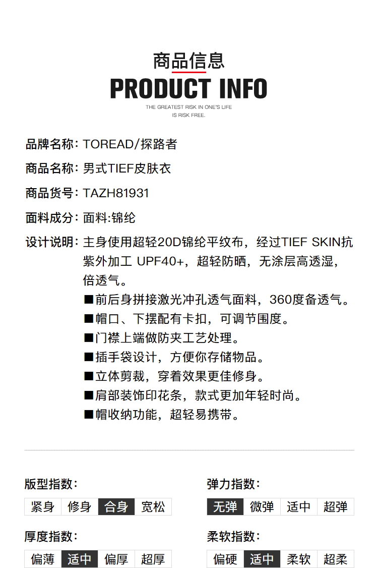 这款探路者男轻薄透气防紫外线皮肤衣,采用20D抗紫外线锦纶面料制成,强度好、抗撕裂、重量轻、防风抗污,还加入防泼水科技,无惧小雨。