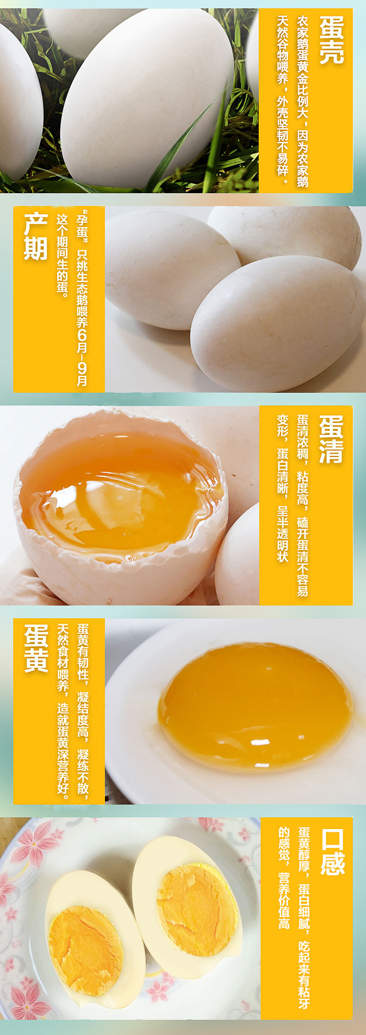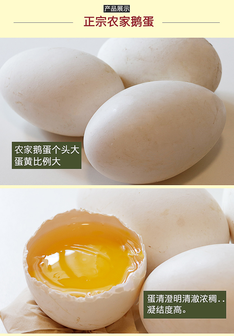 这款狮头鹅蛋自然散养,远离城市污染,鹅蛋个头饱满,约是平常鸡蛋的2倍,鹅蛋中含有丰富的营养成分,如蛋白质、脂肪、矿物质和维生素等,容易被人体吸收利用,是老年人、儿童、体虚、贫血者的理想营养食品。