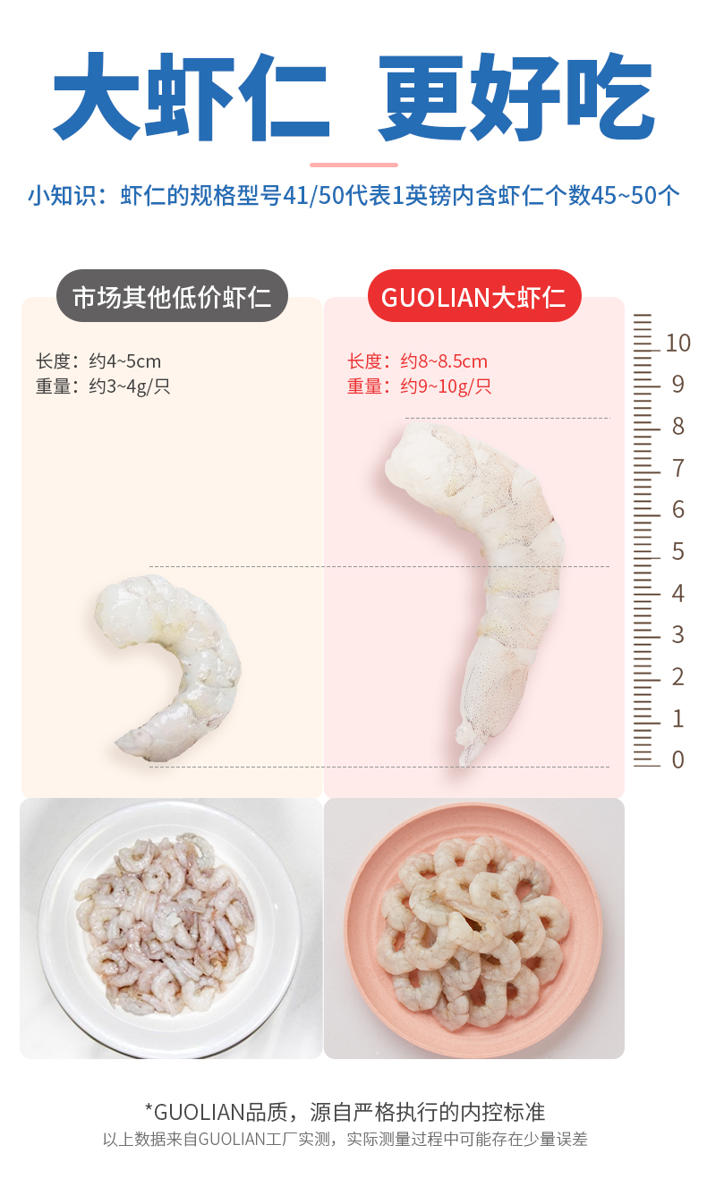 这款虾仁型号41/50代表1英镑内含虾仁个数45~50个,一包是250g的,单只约8-8.5cm,一包约22-27只虾仁。优选鲜虾活虾,去壳去虾线,口感弹嫩鲜滑爽口,营养丰富。