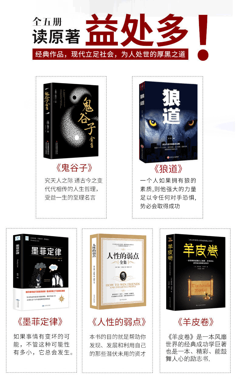 抖音热门推荐书籍,鬼谷子+墨菲定律+人性的弱点+羊皮卷+狼道书籍,读完这5本书,没有你进不了的圈子,让人受益一生的5本书籍,好书精选。领券链接点此