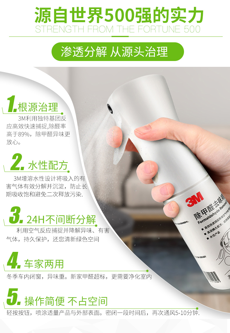 利用独特基团反应高效快速捕捉并降解异味、有害气体,除醛率高于89%,3M增溶水性设计,将吸入的有害气体有效分解并沉淀,防止长期吸收饱和避免二次释放污染。喷嘴设计,操作简单,不占空间。领券链接点此