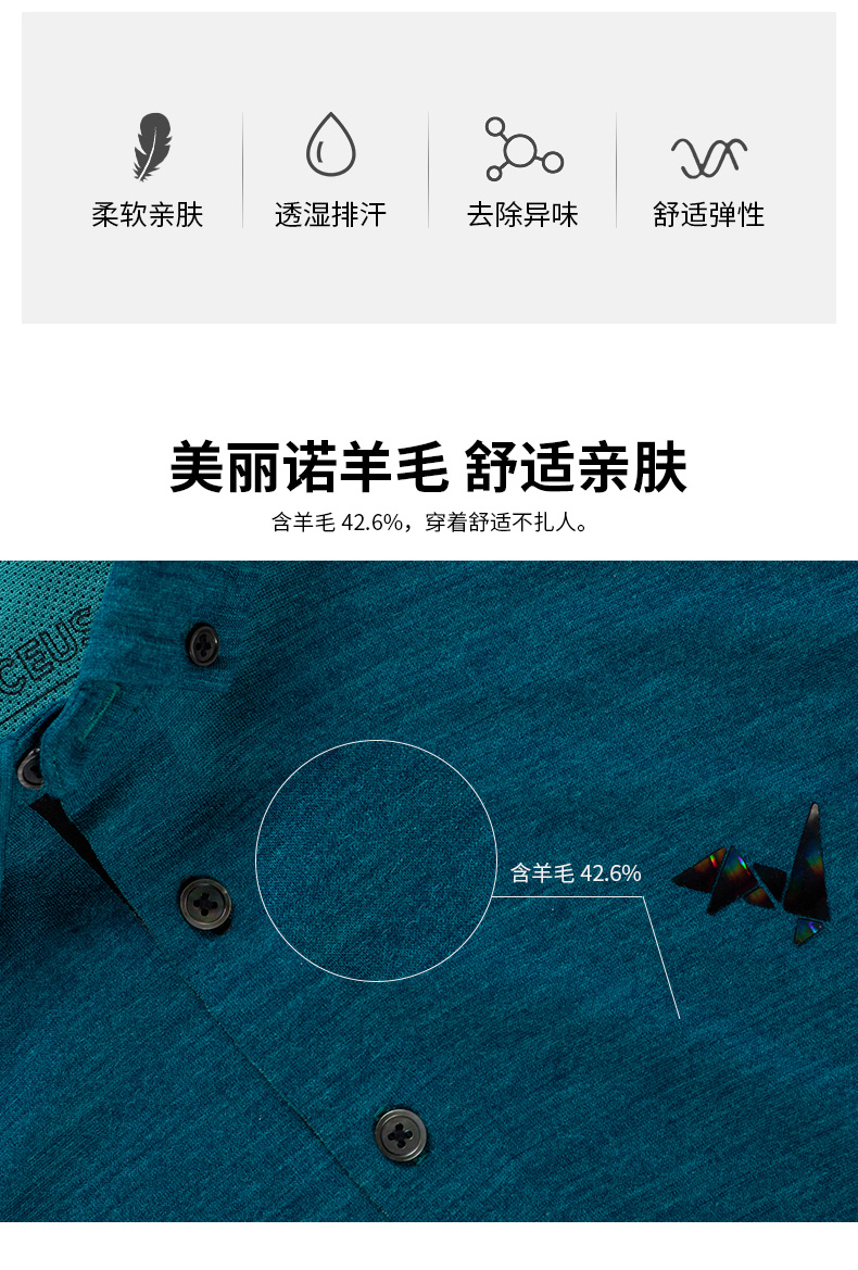 美利奴羊毛是最优的天然吸湿快干纤维,是天然恒温材料,秋冬可作为中间层保暖,炎热的夏季体表大量出汗后,使用超细美利奴羊毛,织成超薄轻盈透气的面料,能吸收大量水气并快速挥发,保持体表干爽舒适。美利奴羊毛还含角质蛋白,可以抑制细菌滋生,抑菌除臭,不会出现汗酸味。