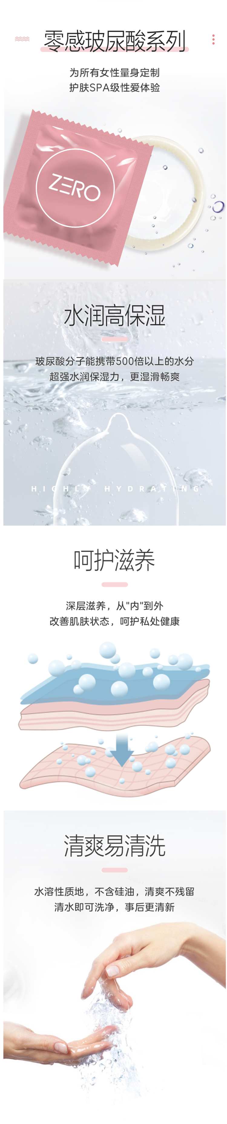 更湿滑畅爽。使用优质乳胶,0硅胶,不添加防腐剂更安全。玻尿酸能携带500倍以上的水分,强保湿力,水溶性质地,不含硅油,清水即可洗净,不易残留。