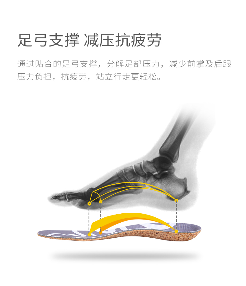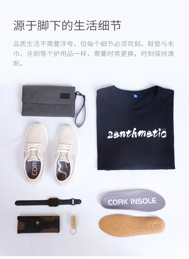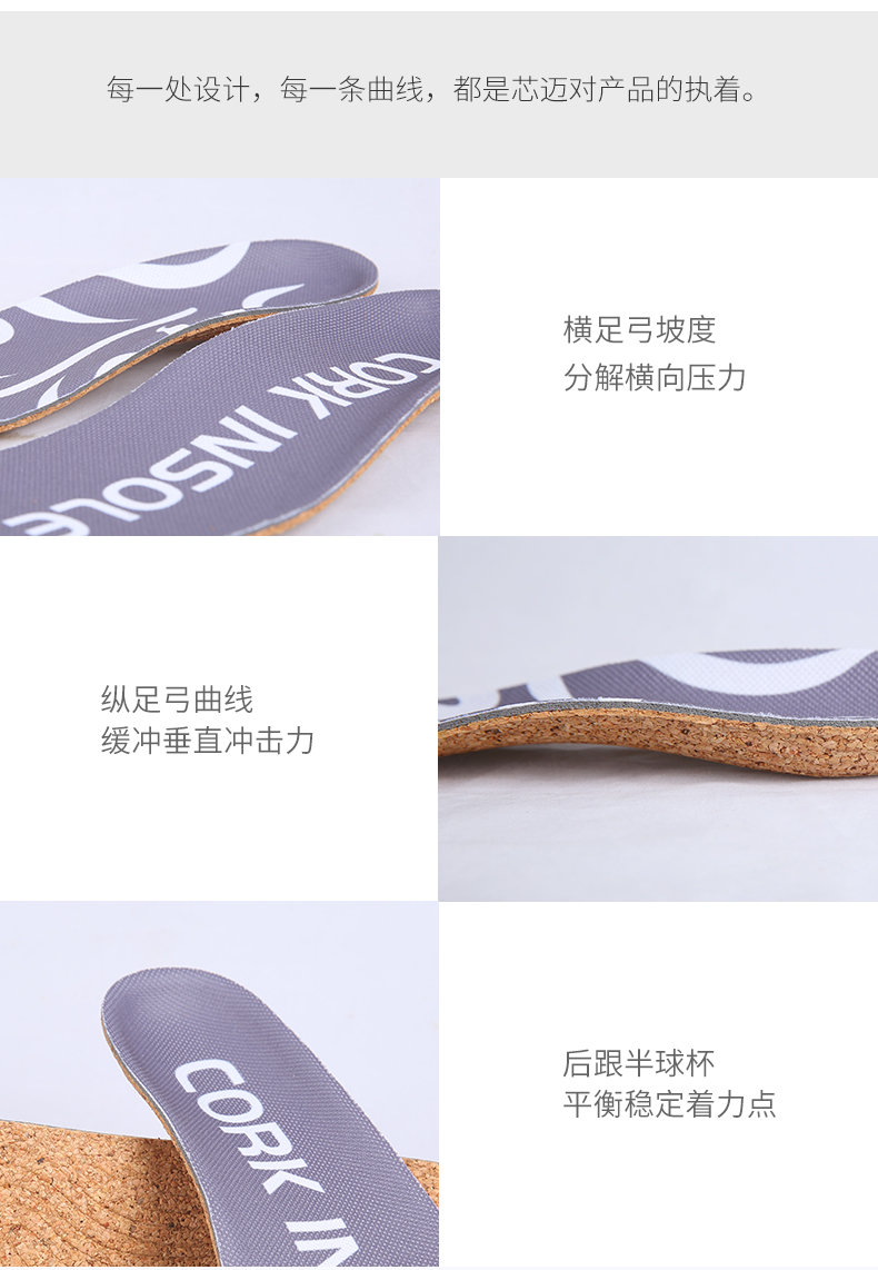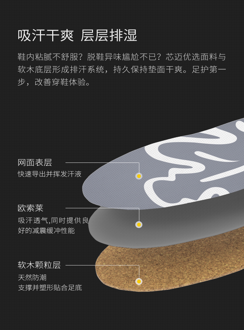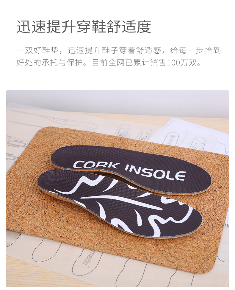 这款软木鞋垫,鞋垫主材源自葡萄牙软木栎树,天然、质轻、弹性、耐磨损,搭配网面布料,快速排出并挥发汗液,脚不闷、不臭。弧面设计,贴合脚弓,分解足部压力,纠正下肢力线,穿着舒适,减少运动损伤。