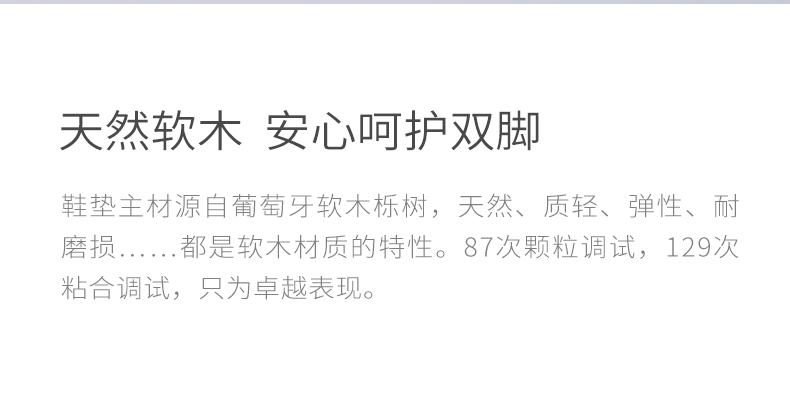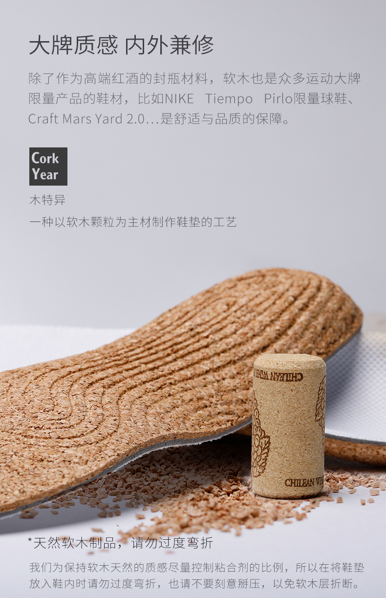 木特异一种以软木颗粒为主材制作鞋垫的工艺,为保持软木天然的质感尽量控制粘合剂的比例,所以在将鞋垫放入鞋内时请勿过度弯折,也请不要刻意掰压,以免软木层折断。