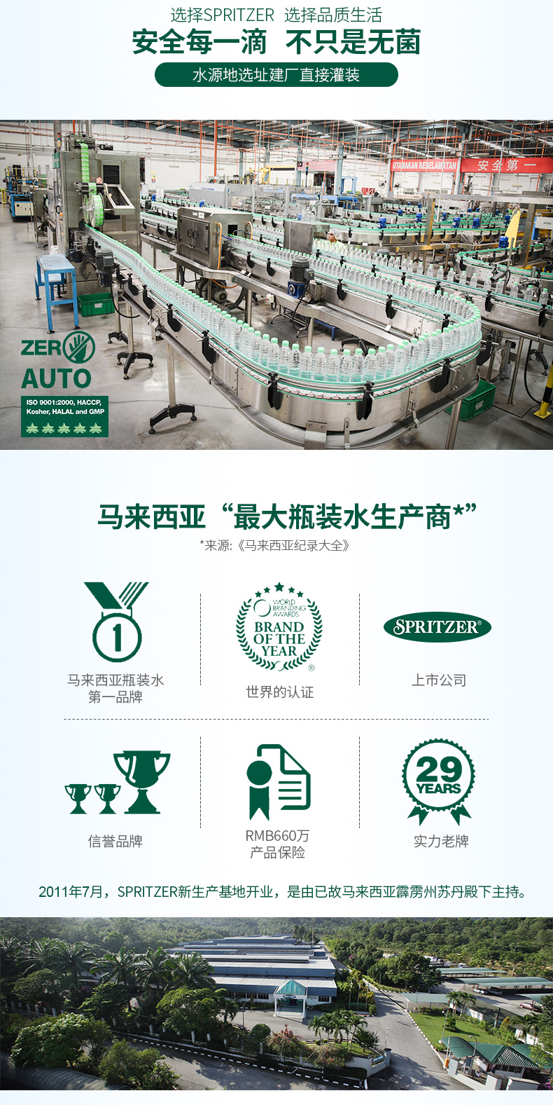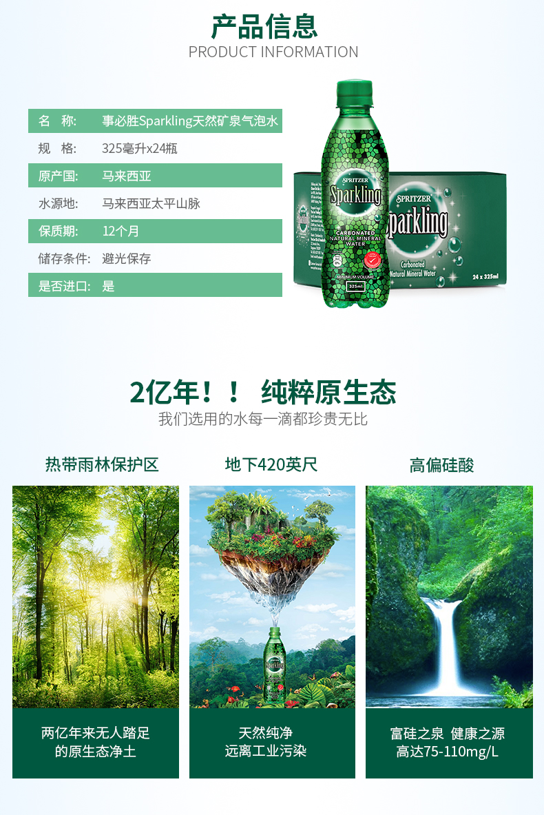 spritzer的水源地是来自马来西亚热带原始雨林。雨林生态保存完好,泉水是天然矿物质弱碱性水,据说是两亿年无人踏足的地方,水质天然纯净,远离工业污染。富含水溶性偏硅酸,可以直接被身体吸收利用,每100毫升 含偏硅酸 75,钙 37.67、镁 3.36,钾 2.71、钠 9.41,规格: 325ml*24瓶