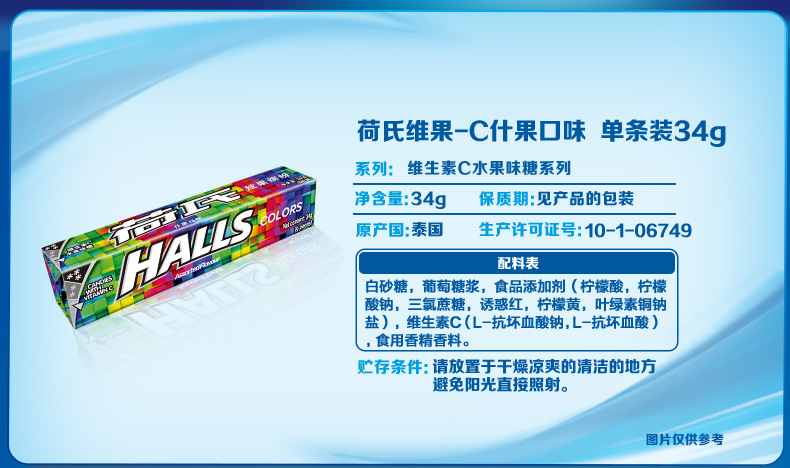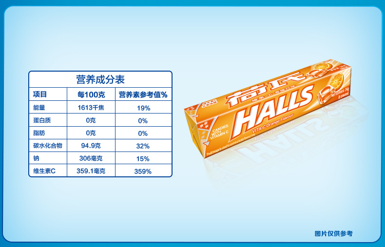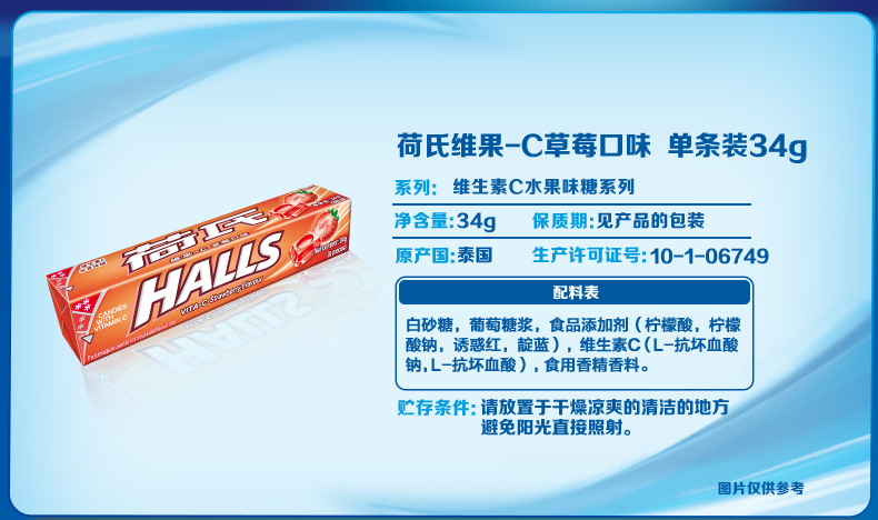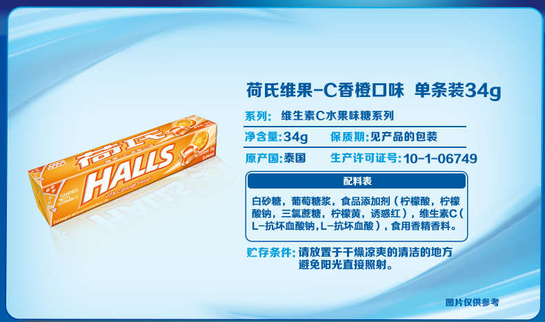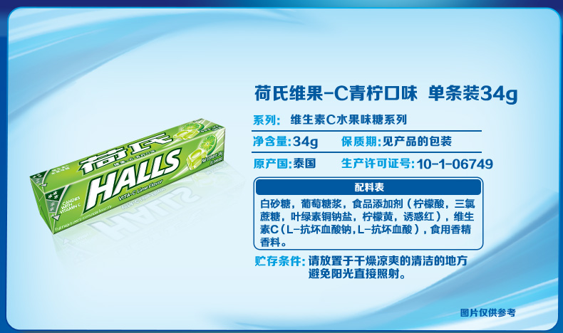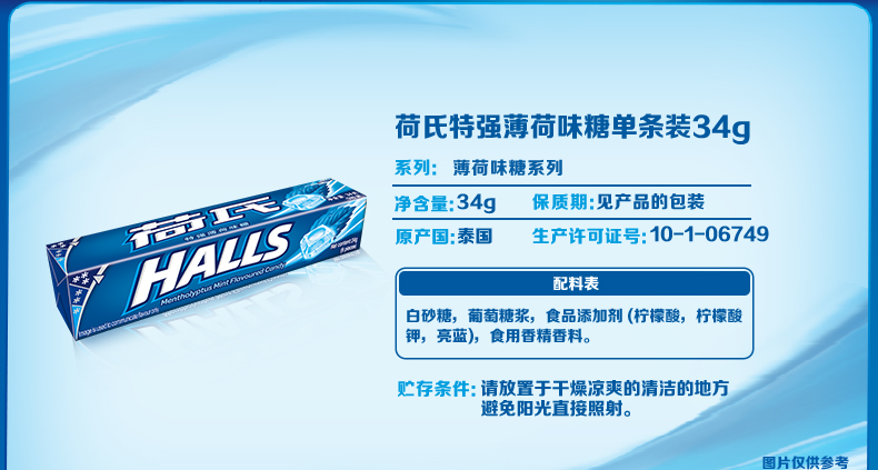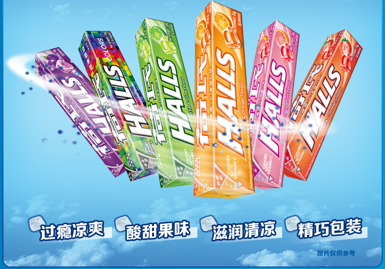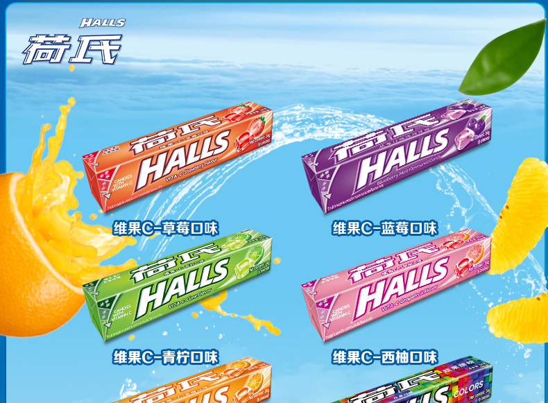 HALLS荷氏糖果是由荷氏兄弟研制发明的全球第一大薄荷糖品牌,现为吉百利下属公司,以其口味众多的薄荷糖的而著称,有纯薄荷糖和水果味的多种。此款薄荷糖为荷氏的招牌商品,入口凉爽过瘾,酸甜果味十足,清凉滋润,每条薄荷糖内附每颗单独小包装。