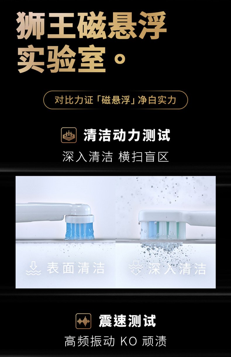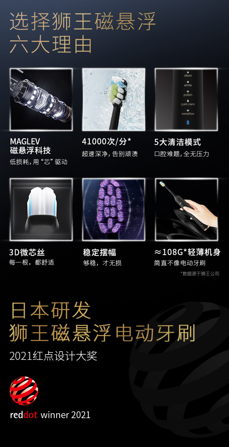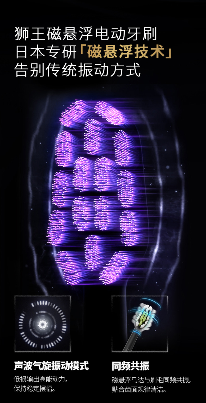 日本研发黑科技—磁悬浮马达动力,超低损耗输出动力,真空感净澈口腔,杜邦高密软毛根根磨圆,3D毛束切面,触感柔、韧、弹,入口舒适保护牙龈,41000次/分钟振动,深入齿缝清洁彻底,机身一体化成型技术,IPX7级防水,5种清洁模式可以选择,护龈、抗敏、抛光、美白、清洁,还有防飞溅功能,不会出现牙膏满天飞的情况。