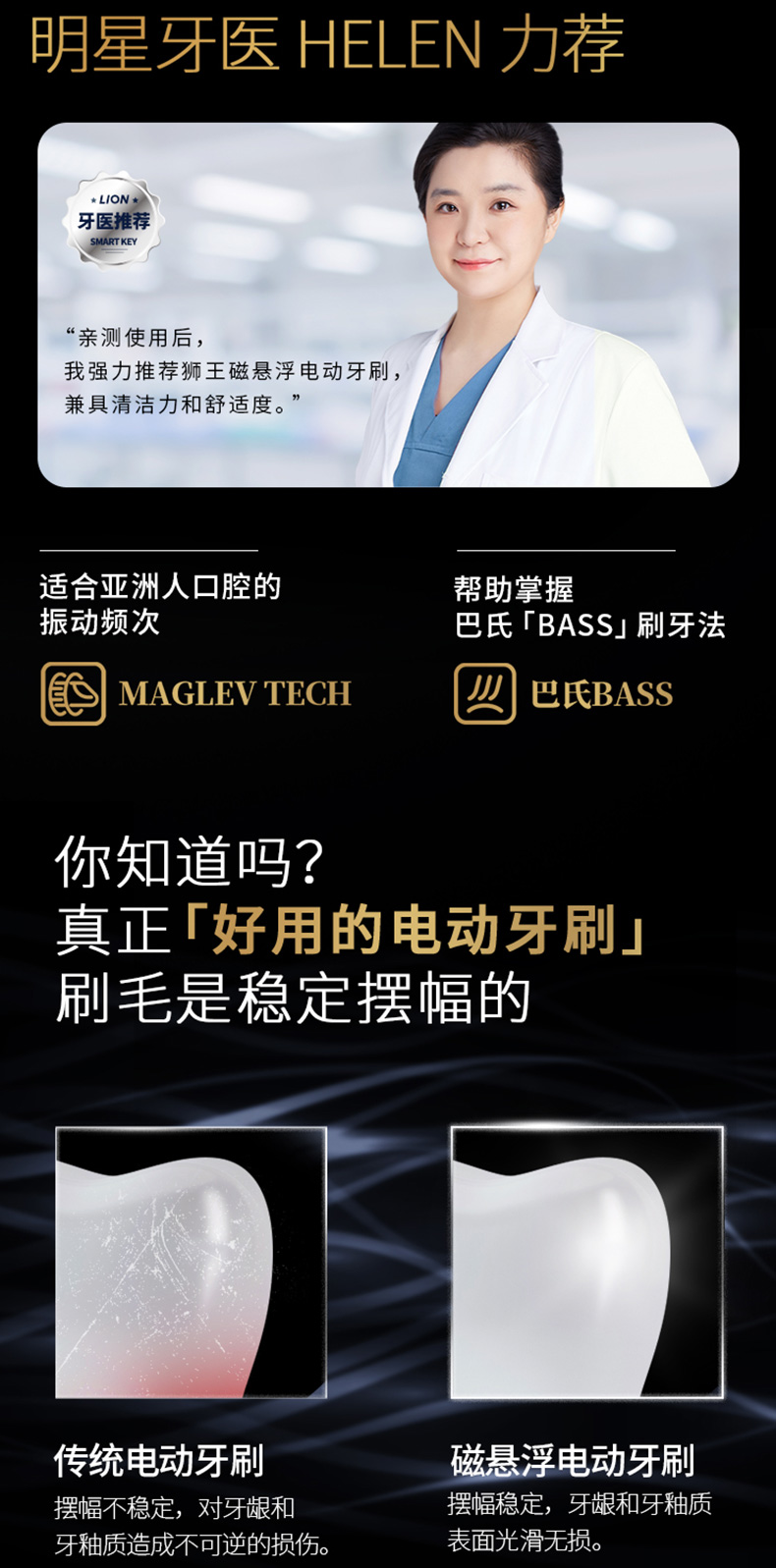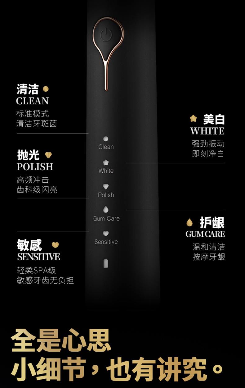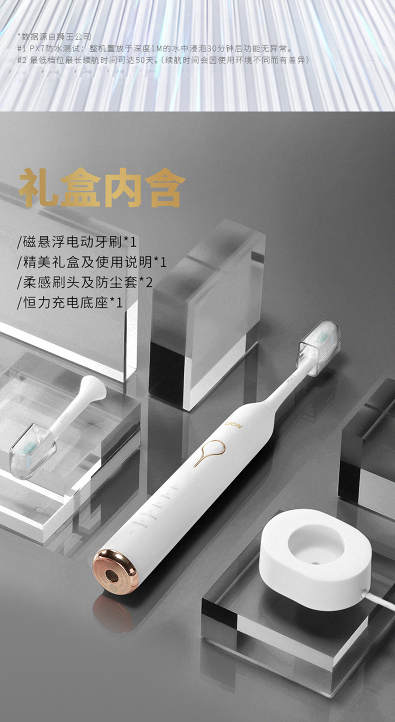 日本研发黑科技—磁悬浮马达动力,超低损耗输出动力,真空感净澈口腔,杜邦高密软毛根根磨圆,3D毛束切面,触感柔、韧、弹,入口舒适保护牙龈,41000次/分钟振动,深入齿缝清洁彻底,机身一体化成型技术,IPX7级防水,5种清洁模式可以选择,护龈、抗敏、抛光、美白、清洁,还有防飞溅功能,不会出现牙膏满天飞的情况。