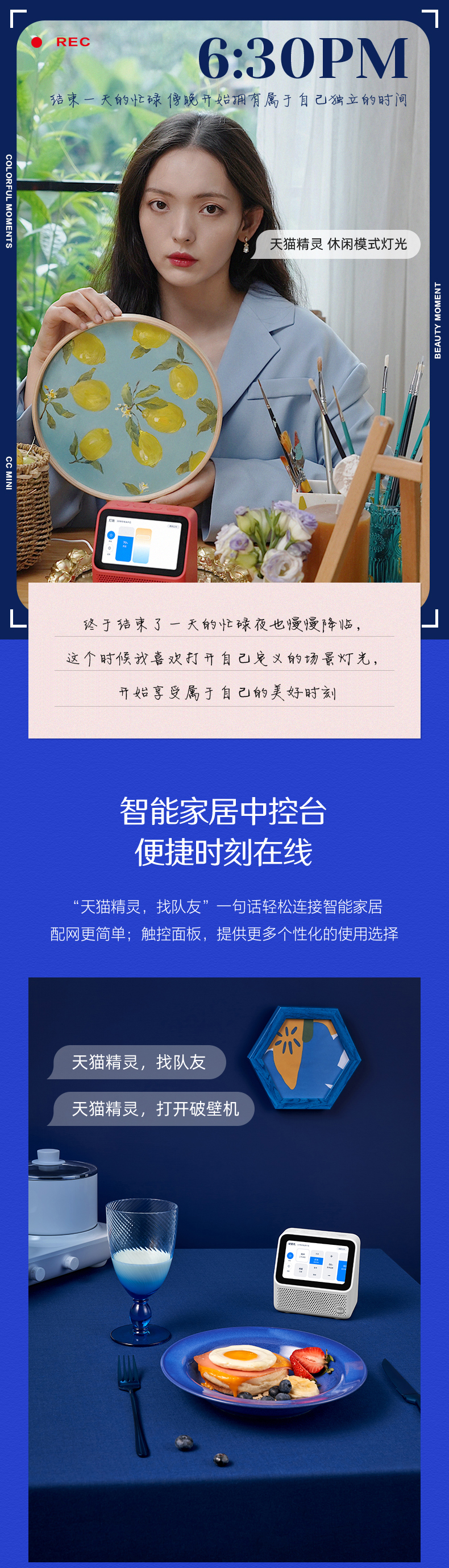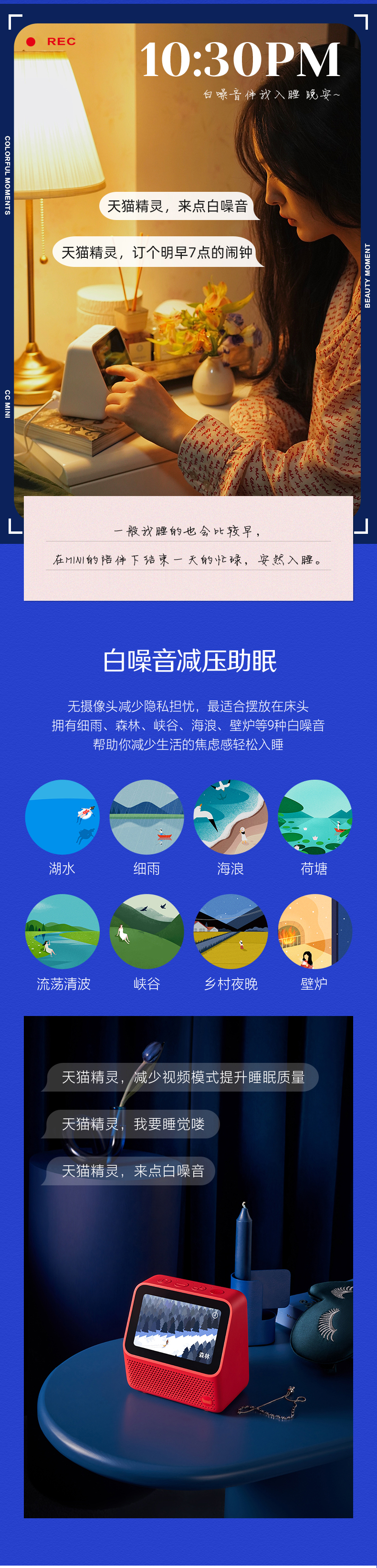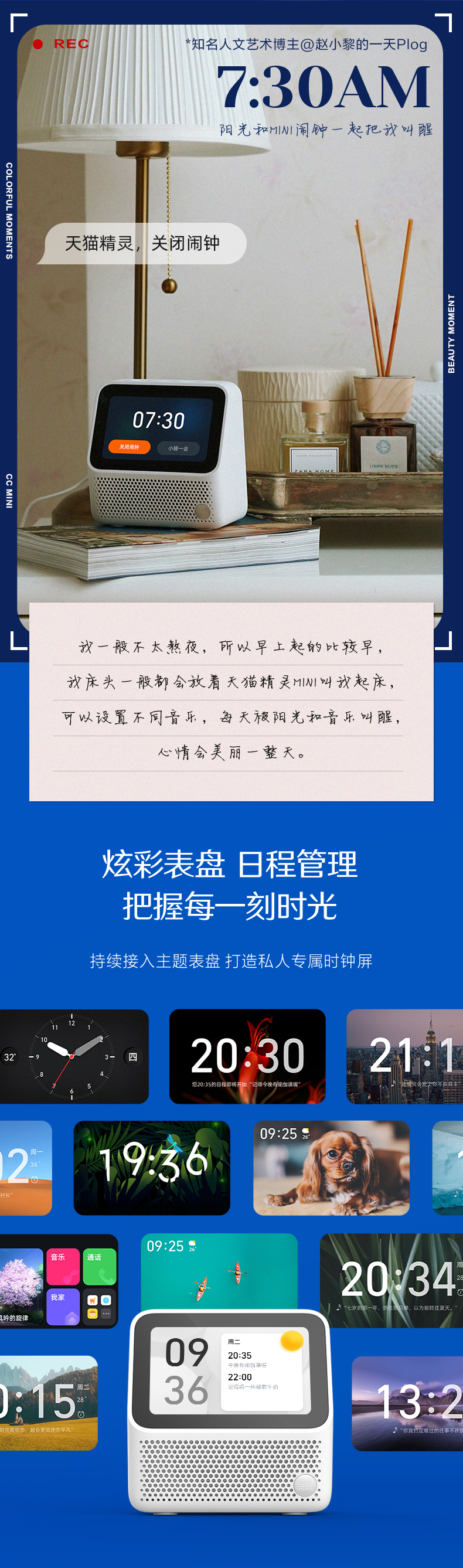 硬件方面:天猫精灵 CC MINI 智能时钟屏使用3.97英寸屏幕,800*480分辨率,支持触控操作,22度5倾角设计,配合自动光感调节亮度,带来舒适观看体验。家族式前出音设计,无风噪管,总体耐听且出色。无内置摄像头,配备可自定义功能的精灵按键,红、白潮流配色,111.6*115.3*84mm小巧精致,适合摆放在床头位置。