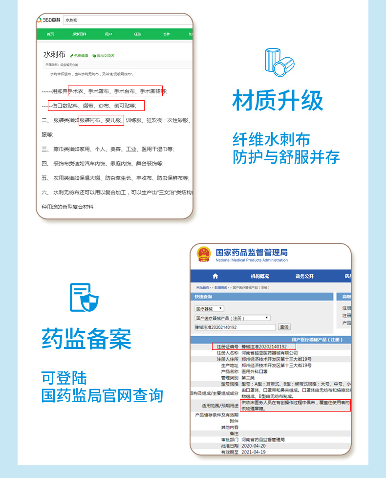 天猫超亚医疗器械旗舰店10.9元,可领3元优惠券,实付7.9元到手, 20支款这个价格。这款超亚 一次性医用外科口罩 ,执行标准号为 YY0469-2011,属于医药推荐标准,注册证号: 豫械注准20202140192,由河南省超亚医药器械有限公司生产,采用吸湿透气无纺布、熔喷布过滤层和拒水pd无纺布3层结构,4D立体结构更贴合脸型,25g/㎡熔喷层,细菌过滤效率≥95%,出厂前均使用环氧乙烷消毒灭菌。
