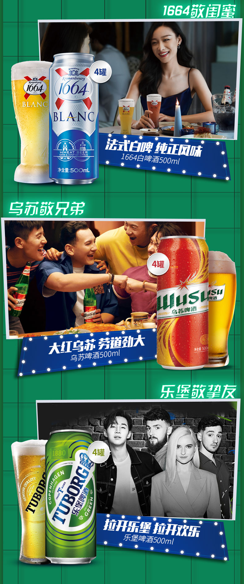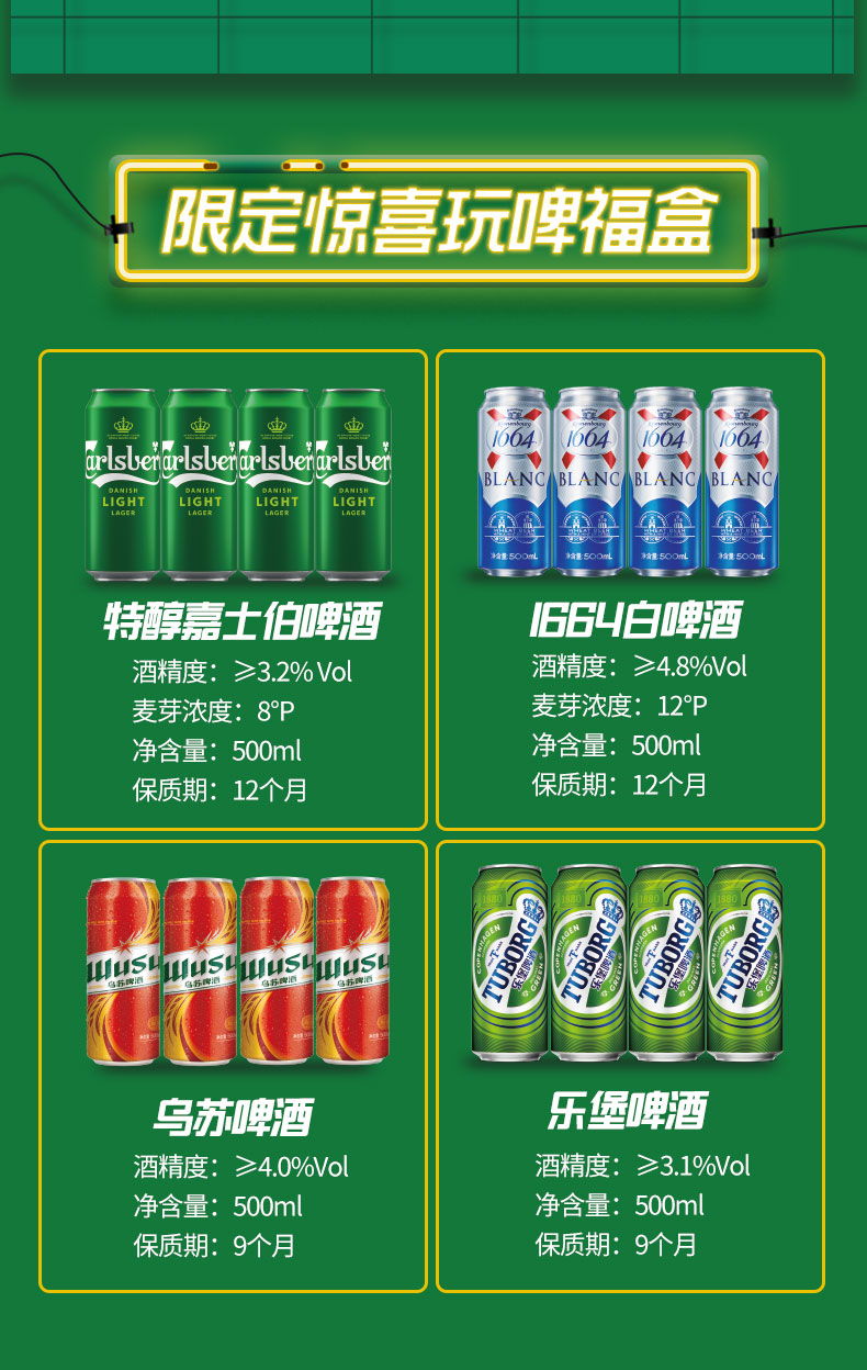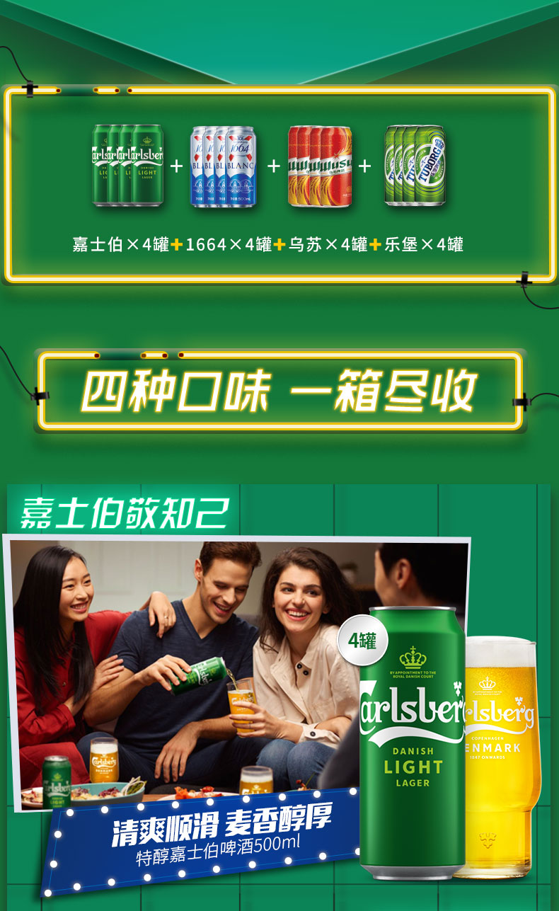 天猫嘉士伯啤酒官方旗舰店119元,下单立减15元,可领15元优惠券,实付89元到手,套装包含嘉士伯*4+1664白啤*4+红乌苏*4+乐堡*4合计500ml*16罐啤酒,性价比很高。