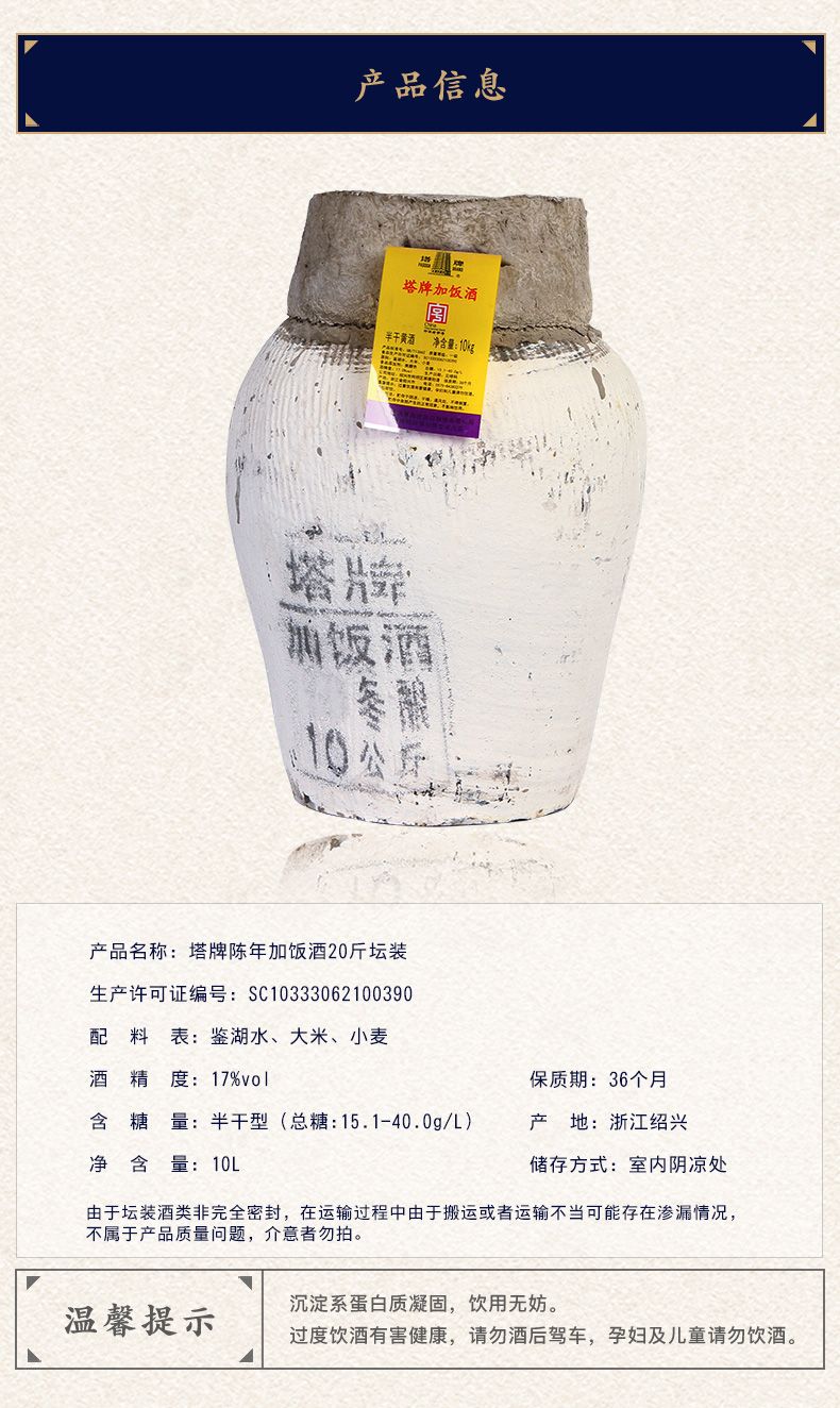 天猫塔牌酒类旗舰店159元,下单立减5元,可领35元优惠券,实付119元到手,直降20元,新低价。这款是20斤的坛装,光运费就不少了,还是很划算的。生产日期是15年~16年,算是5、6年陈酿了。