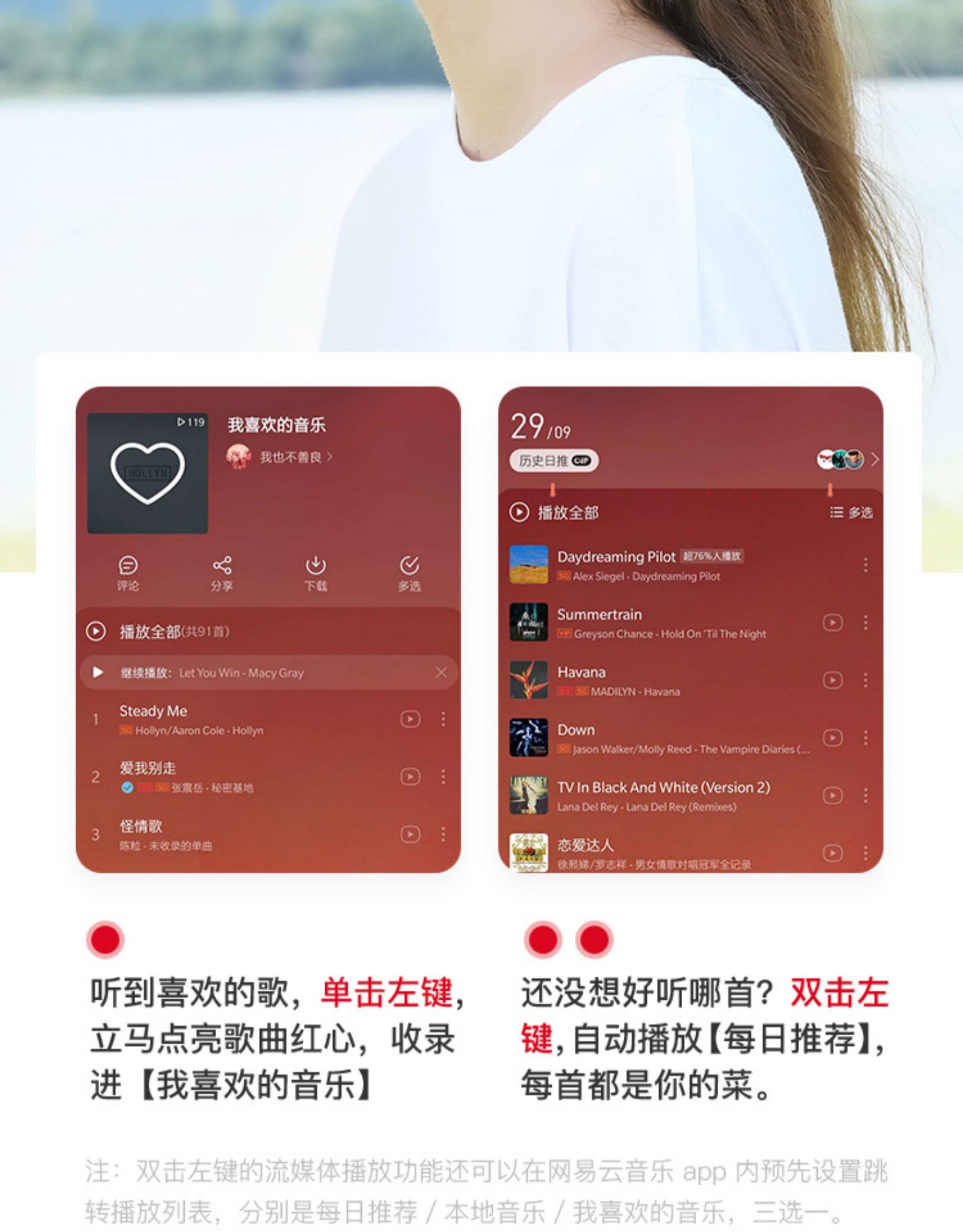 深度绑定云音乐APP,一键收藏心动好歌,一键自动播放私人歌单。借助网易云音乐A算法和海量曲库,你可以用它,简单自在地发现好歌、收藏好歌。