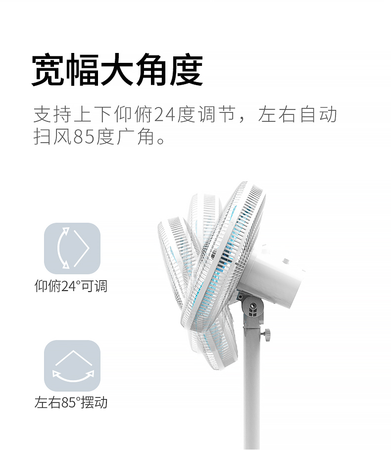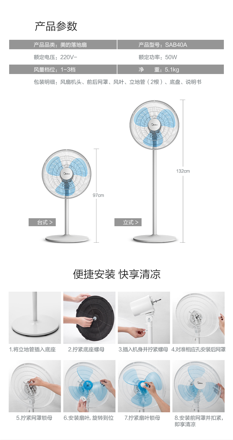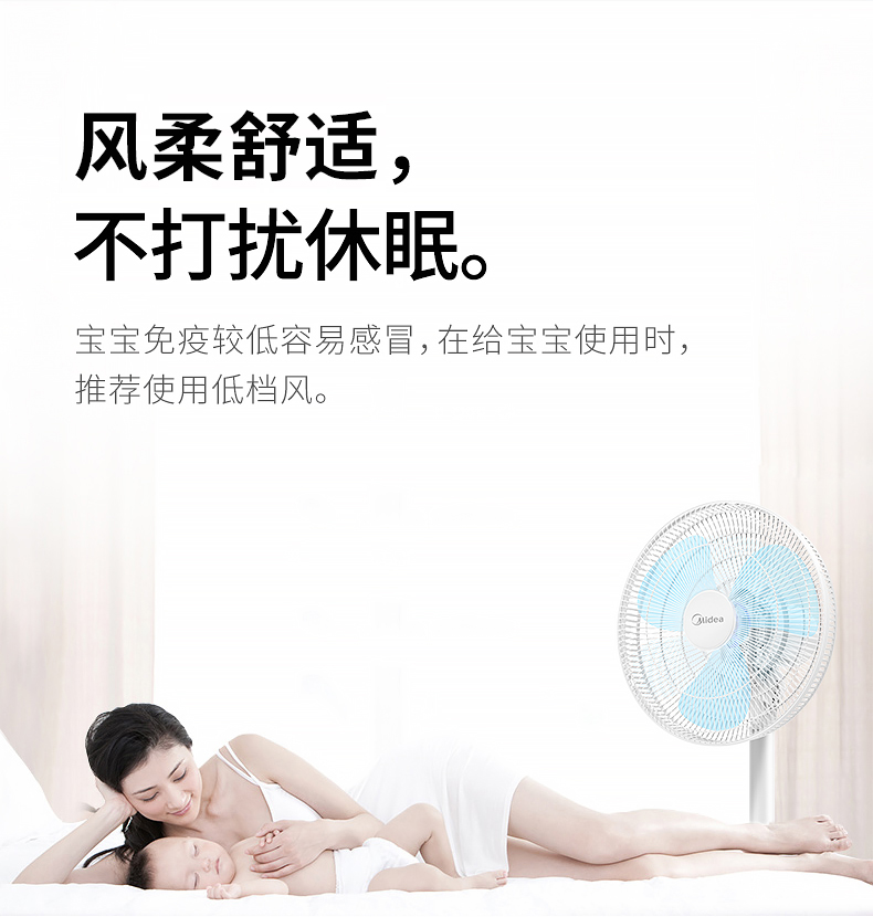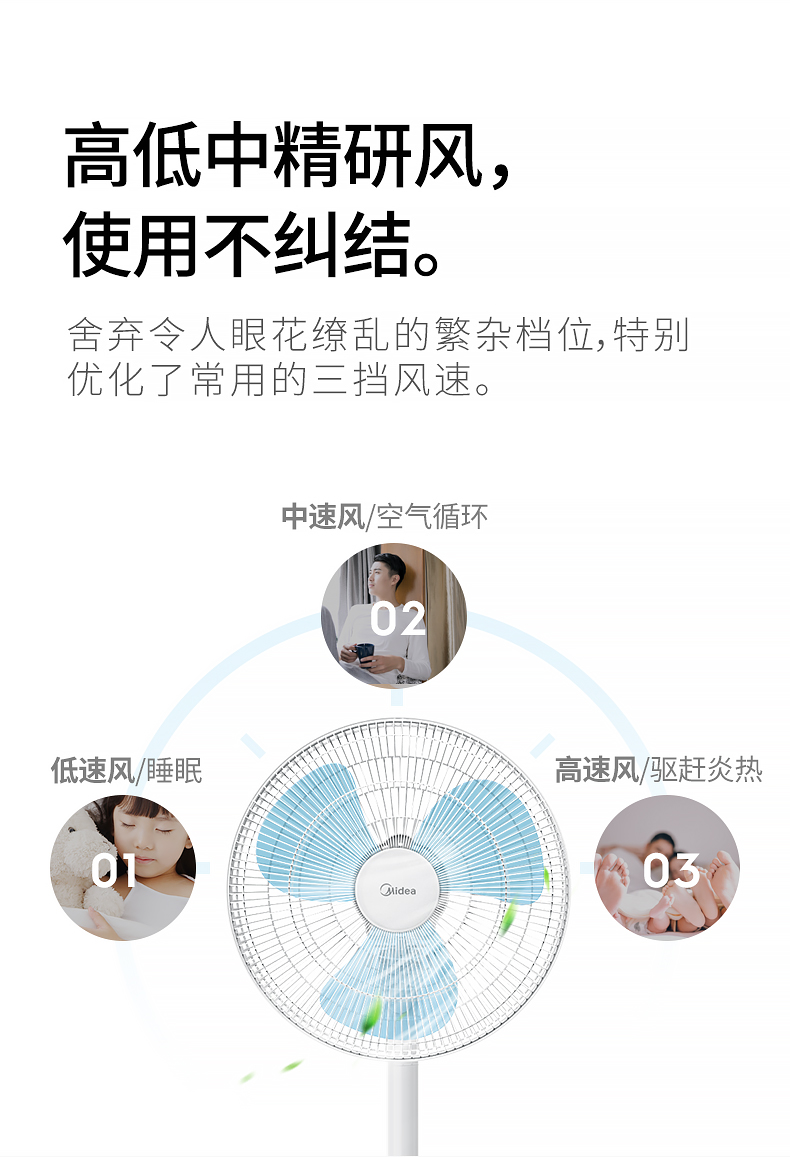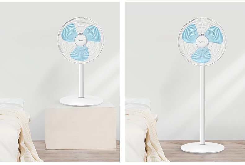 这款美的SAB40A 电风扇,采用40cm牛角三叶风扇,最大风量可达56m³/min,电机功率50W,极简设计立杆,可高低调节,电机尾部有3档风速可控制,摆头角度85°,还可手动28°上下调节。一级能效,适合15-25㎡客厅。