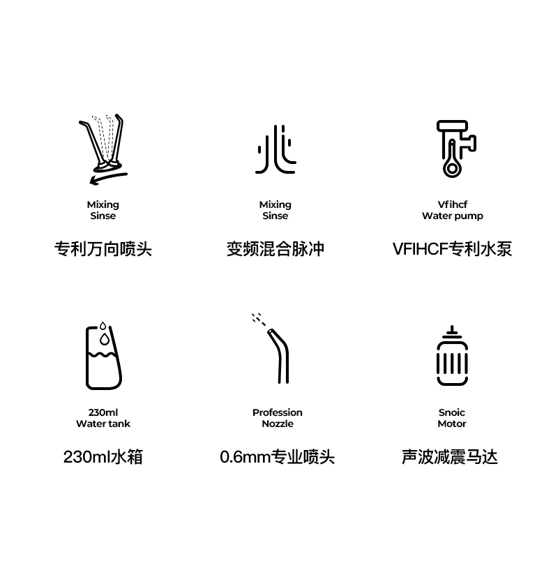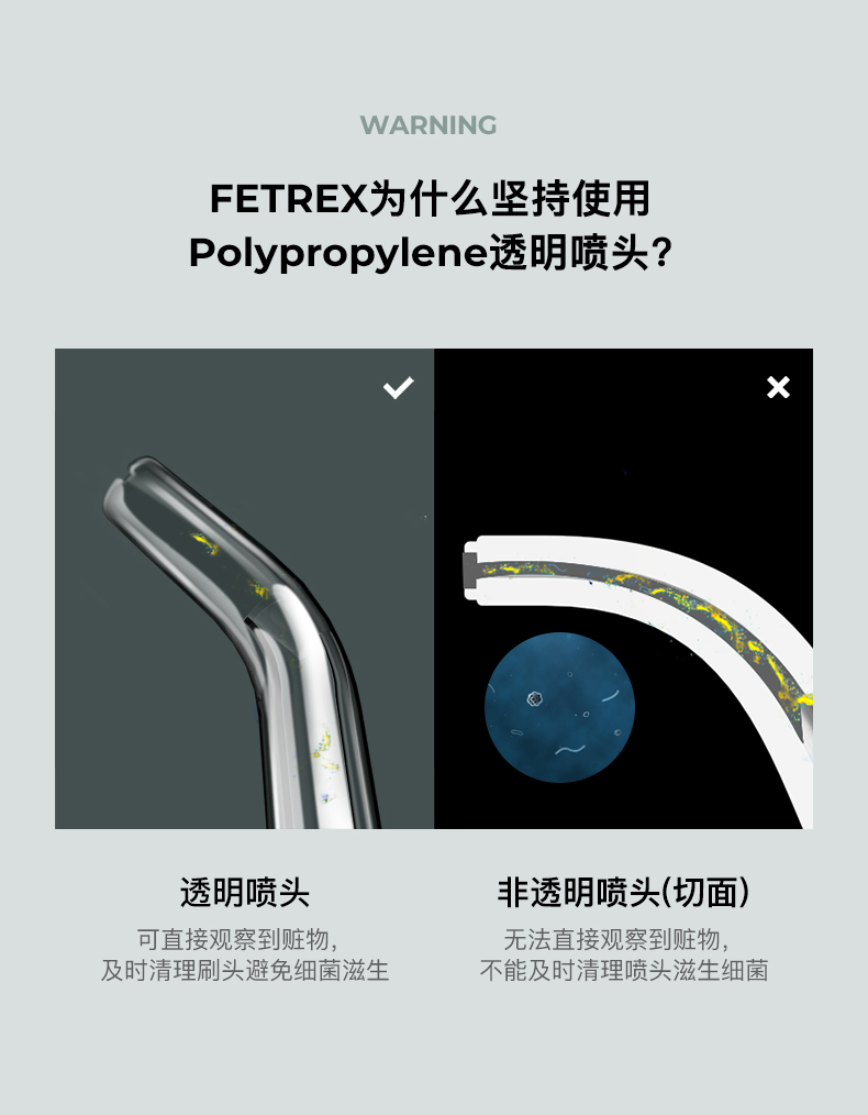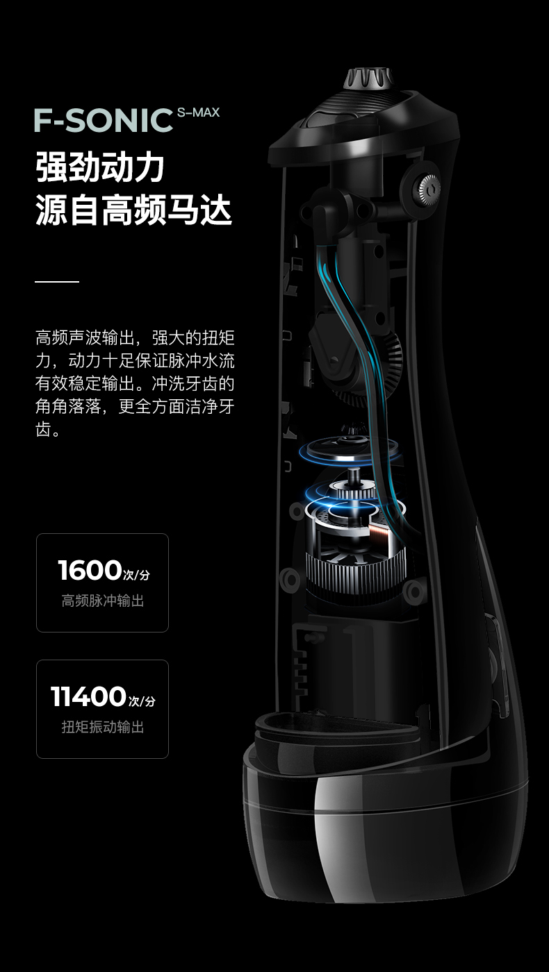 F-SONIC专利高频马达,高频脉冲输出高达1600次/分钟,扭矩震动输出11400次/分钟,具有个性化的5档模式调节,全方位的冲洗,不管是新接触者还是正畸人群,都能充分满足。