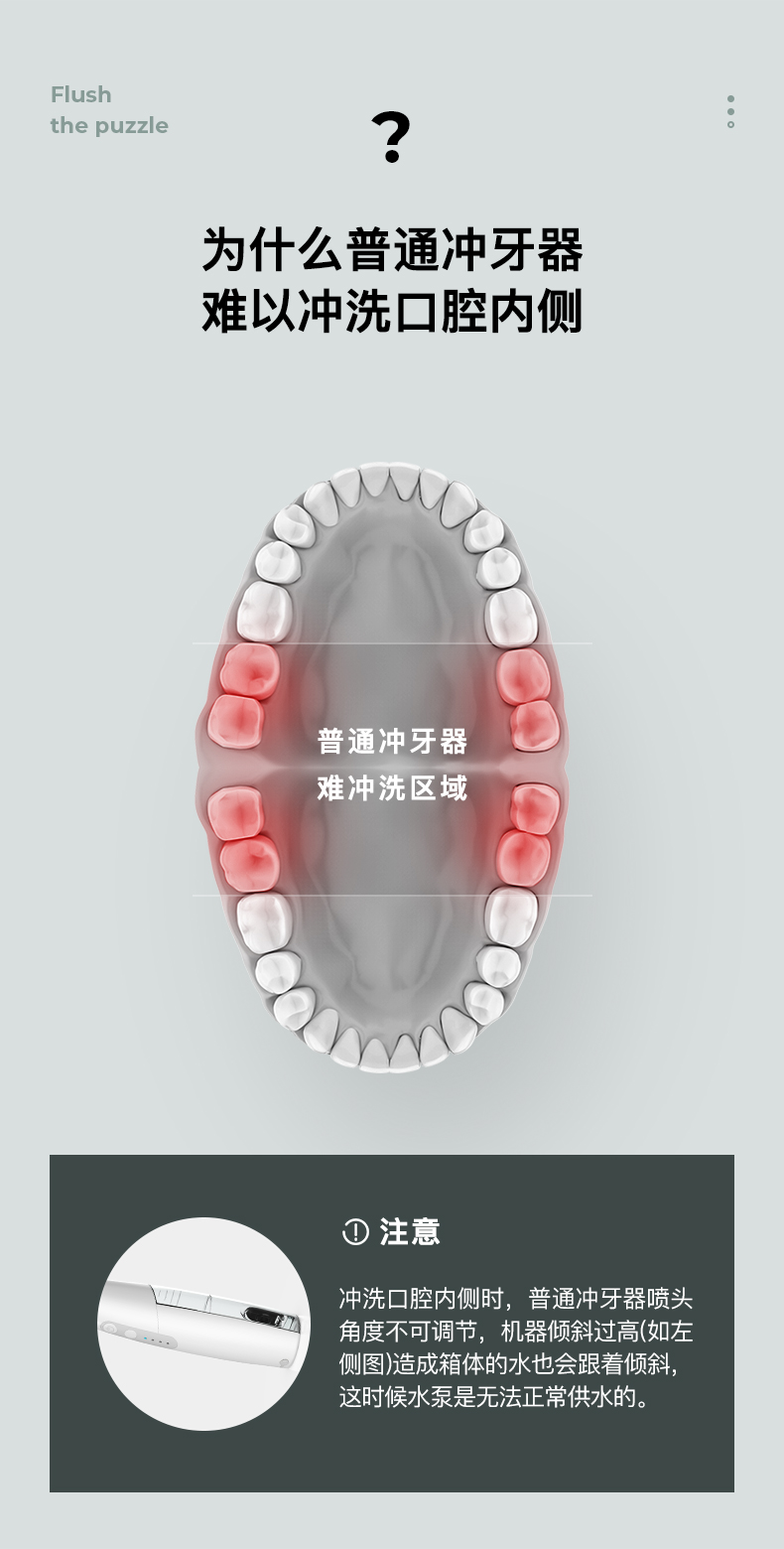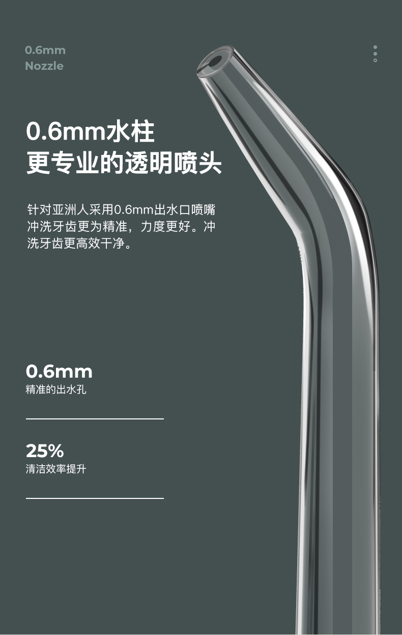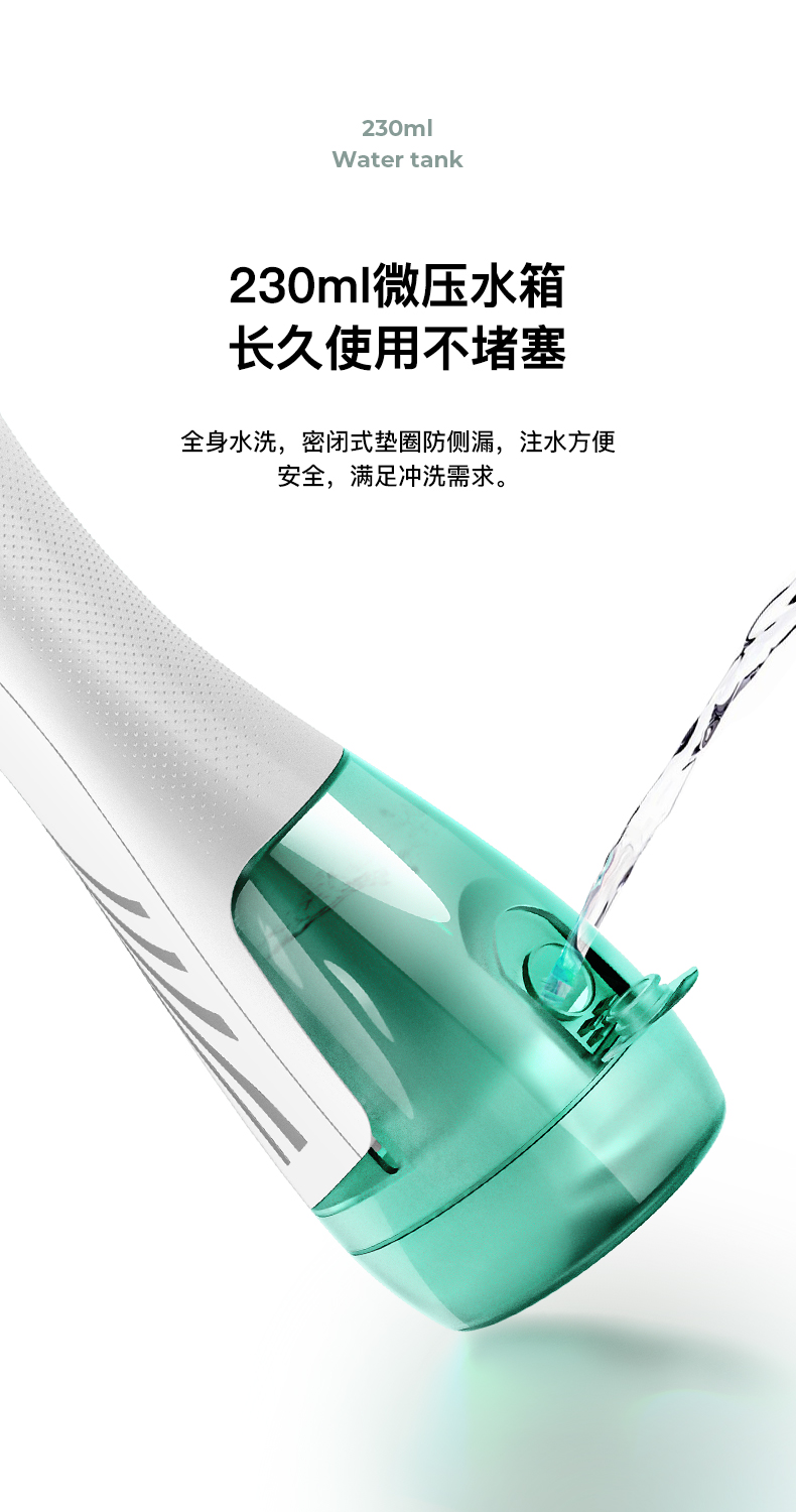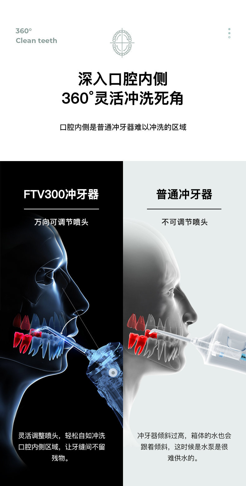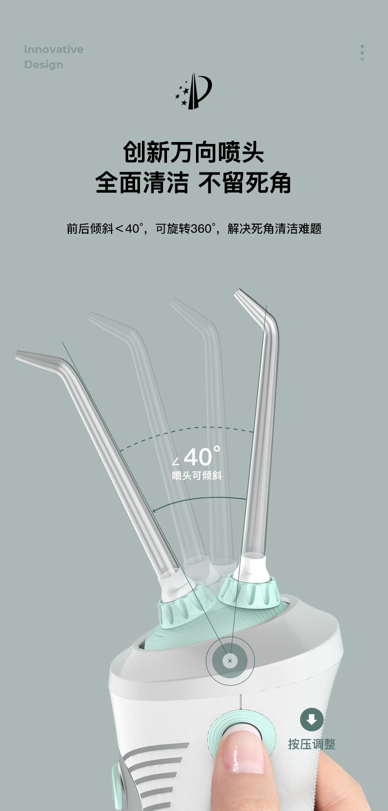 创新的万向喷头,前后可以倾斜40°,还可旋转360°,充分清洗口腔内侧的难冲洗区域,一般的冲牙器喷头是固定的,角度不可调节,机器倾斜过高时水泵无法正常供水。