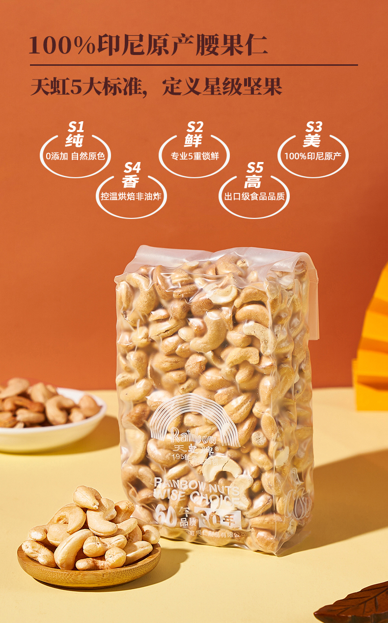 印尼进口大颗粒腰果仁,经过低温烘焙而成,果仁细腻白嫩,清脆可口,营养丰富。中医学认为,腰果味甘,性平,无毒。可治咳逆、心烦、口渴。《本草拾遗》云:腰果仁主治渴、润肺、去烦、除痰。《海药本草》亦云:主烦躁、心闷、痰鬲、伤寒清涕、咳逆上气。经常食用腰果有强身健体、提高机体抗病能力、增进性欲、增加体重等作用。