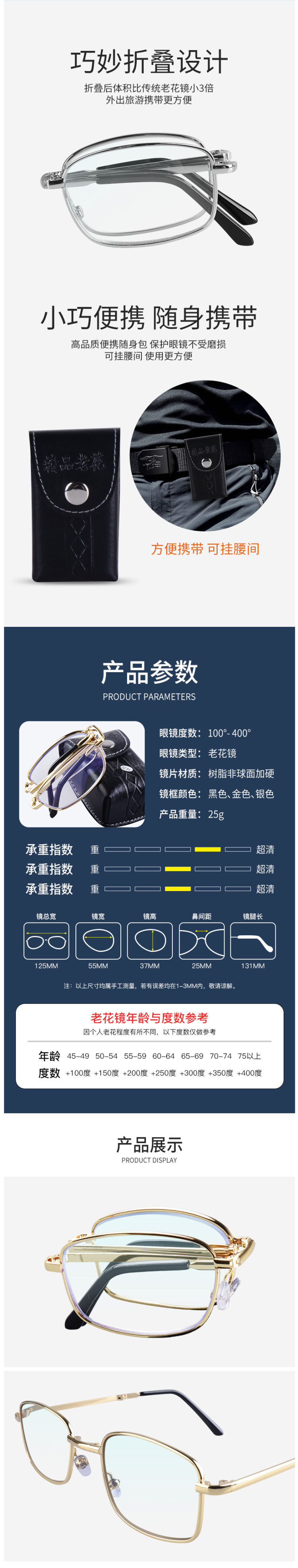 这款申沐男女可折叠超轻防蓝光老花镜,选用非球面树脂镜片,佩戴高清舒适护目,颜色不失真,不泛黄。可折叠全框镜架,小巧便携。同时具备看远看近功能,适合走路、开车、看电视、看书等活动,一副搞定,无须频繁摘戴。