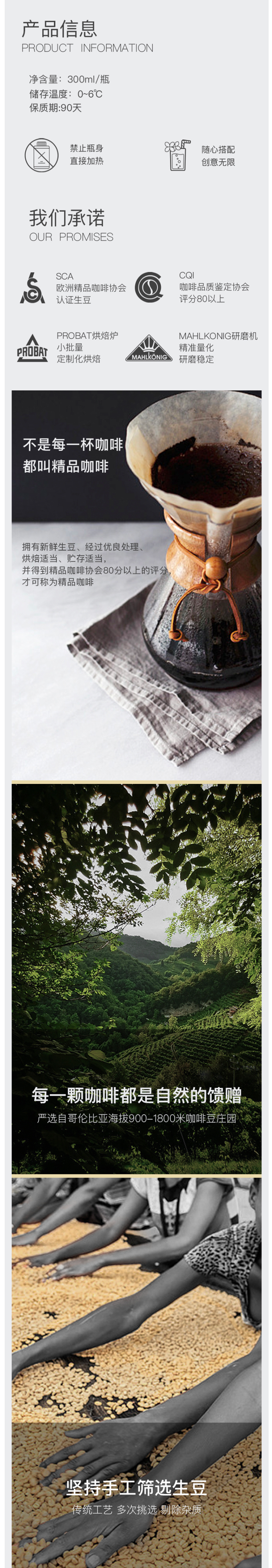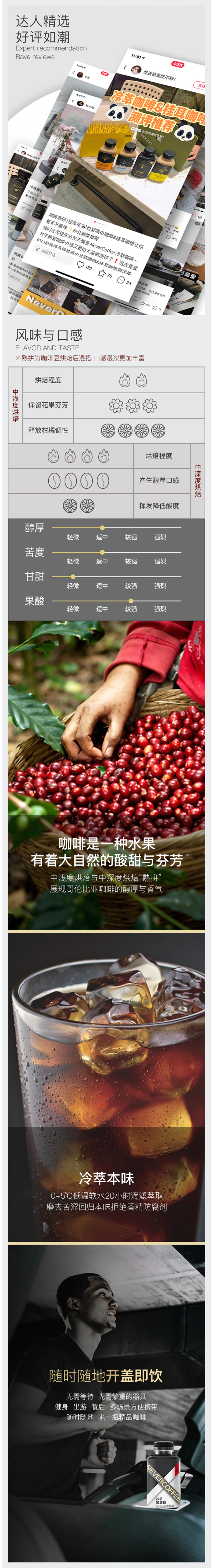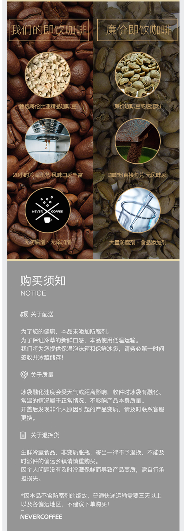 这款NeverCoffee 冷萃即饮咖啡,严选哥伦比亚的阿拉比卡咖啡豆,以中浅度和中度烘焙熟拼,历经20小时滴滤萃取,口感绵密,醇厚奶香。