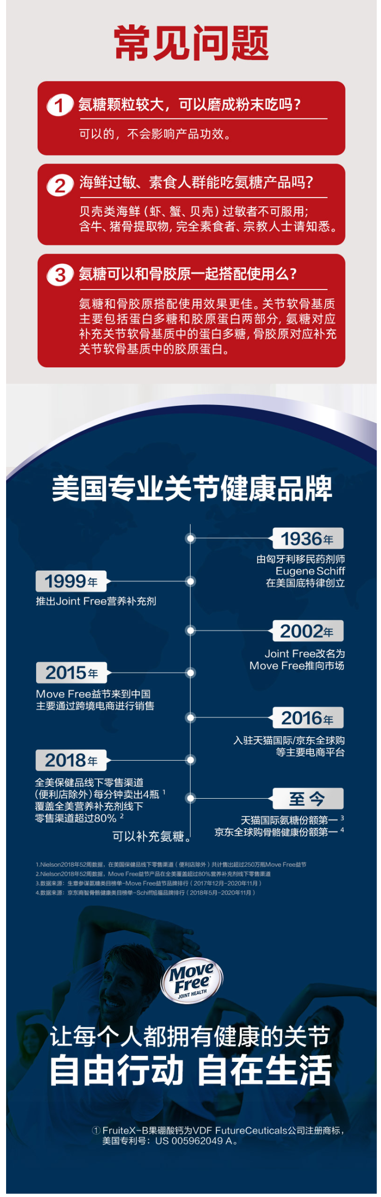 Move Free维骨力,是美国关节保健品市场上的第二大品牌,母品牌Schiff有近80年历史。Move Free最大的特点,是针对骨关节保健盲区“软骨”进行营养补充,核心营养素是“氨基葡萄糖”,也叫氨糖,美国有专门的医疗机构论证过氨糖的有效性。