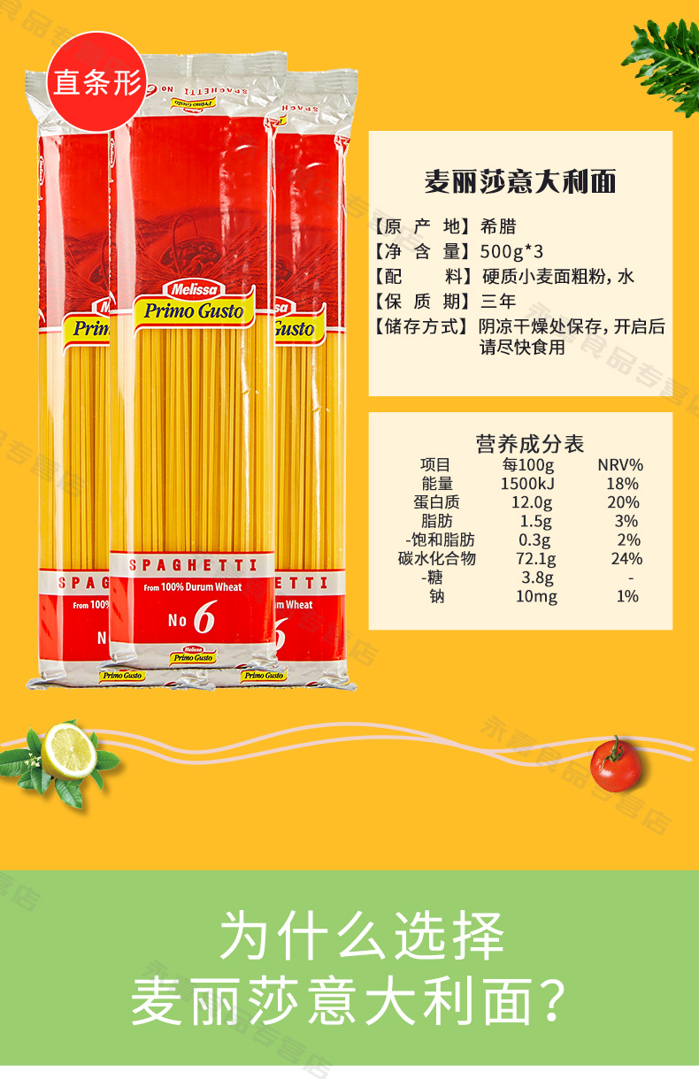 这款意面,希腊原装进口,以杜兰小麦为原料,这个品种属于硬质小麦,具有高密度、高蛋白质、高筋度等特点,做成的意大利面呈金黄色,耐煮、面质软弹,口感劲道爽滑,其中每100g含蛋白质12g、脂肪1.5g、不仅可以满足人们所需营养,还可以增加长时间的饱腹感;采用低温烘干健康无添加,适合所有人群食用。