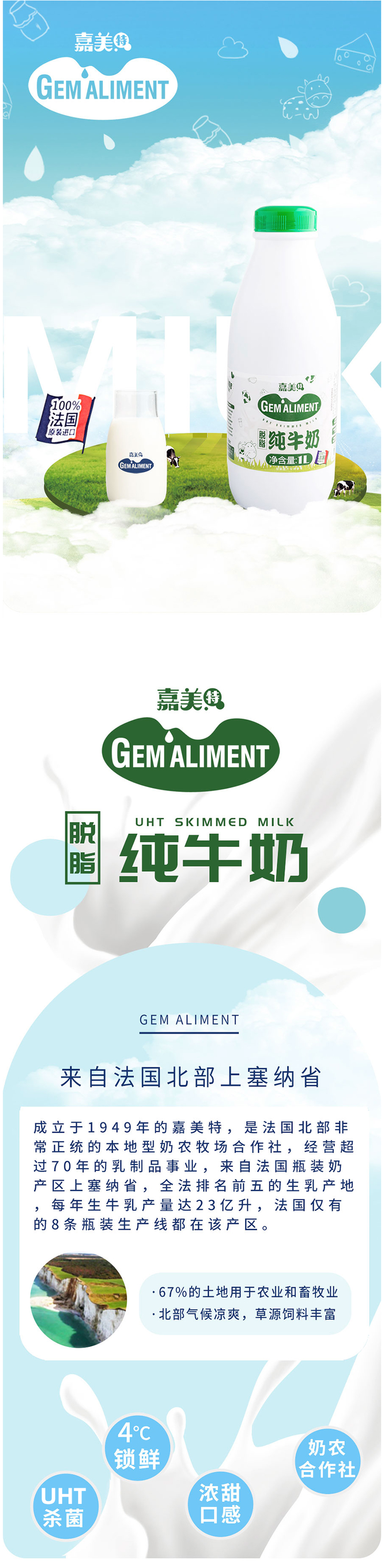 这款嘉美特脱脂纯牛奶,法国原装进口,非国内灌装,100%优质生牛乳,超高温杀菌,4℃锁鲜,0防腐剂、0香精、0色素添加,奶瓶均由工厂自行生产,严格把控质量与牛奶品质。
