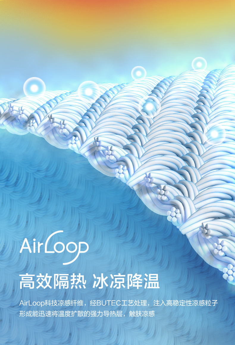 内衣内层采用AirLoop科技凉感纤维,经BUTEC工艺处理,注入高稳定性凉感粒子,形成能迅速将温度扩散的强力导热层,穿戴时带来瞬时的凉感体验。