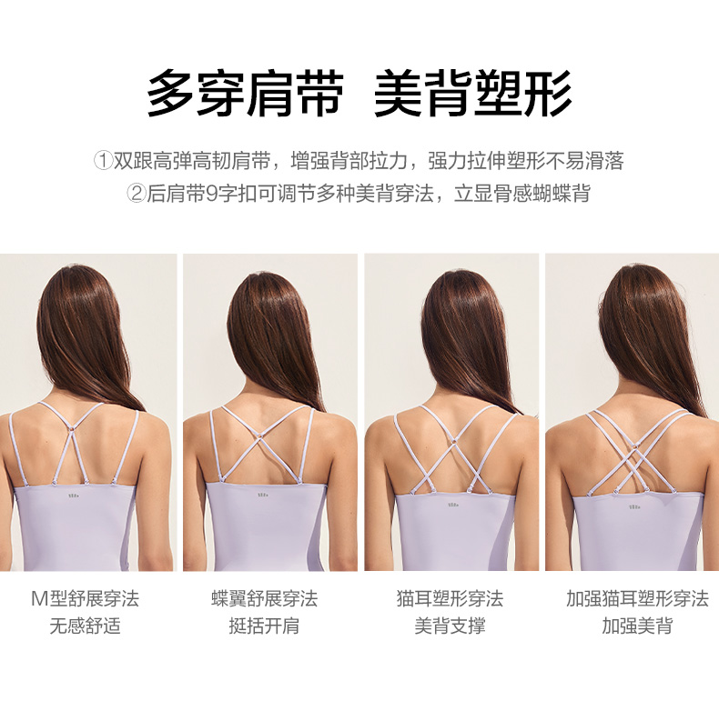 吊带采用双跟高弹高韧肩带,增强背部拉力,强力拉伸塑形不易滑落;后肩带9字扣可调节多种美背穿法,立显骨感蝴蝶背。