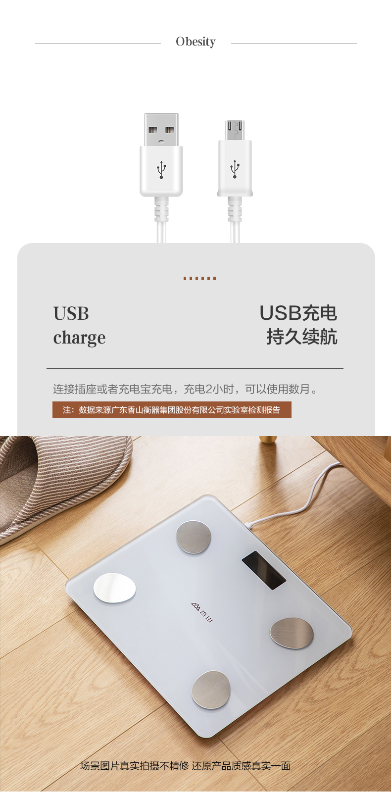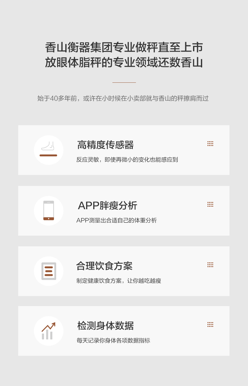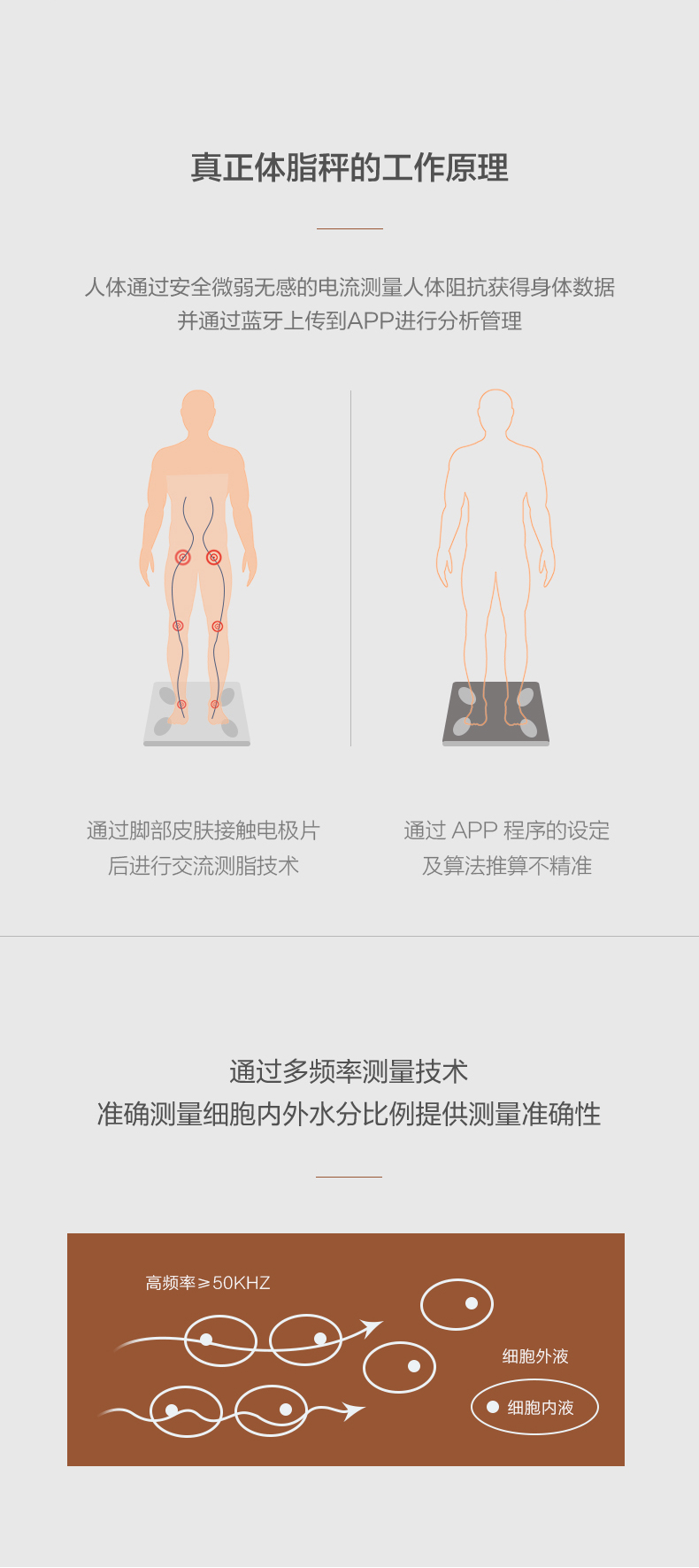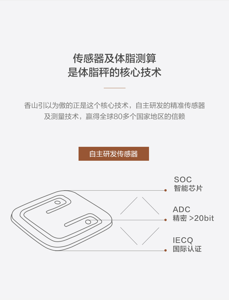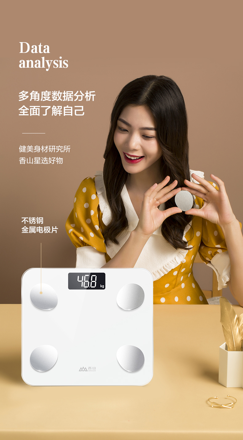 一般的体脂秤在秤面都有电极片,其原理是通过脚部皮肤接触电极片后,使用交流测脂技术得到所需的身体数据。这款香山智能体脂秤,采用4点接触式电极测量法,通过配置电流和电压进行精准测量。