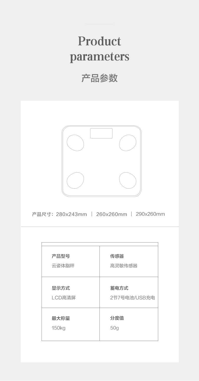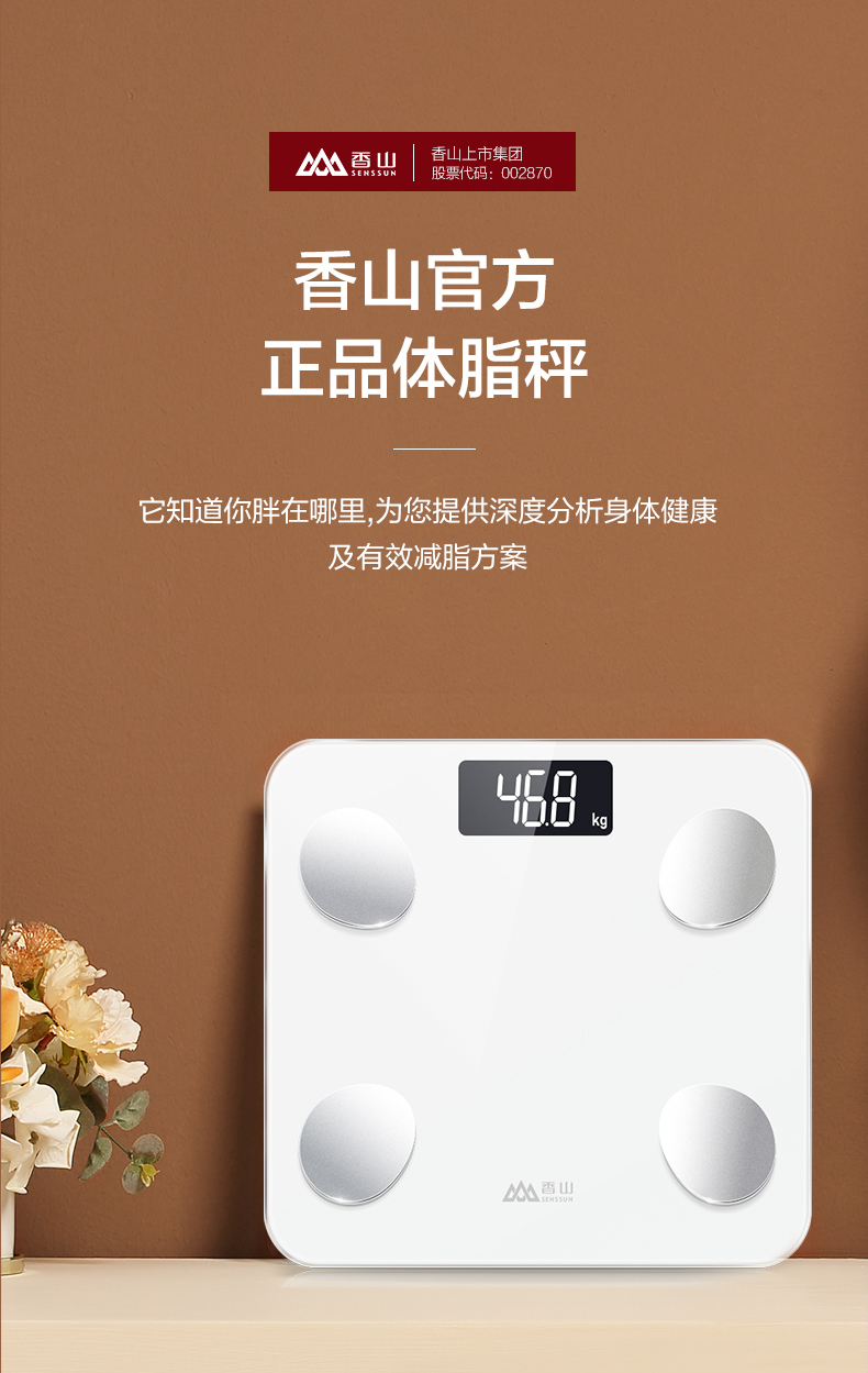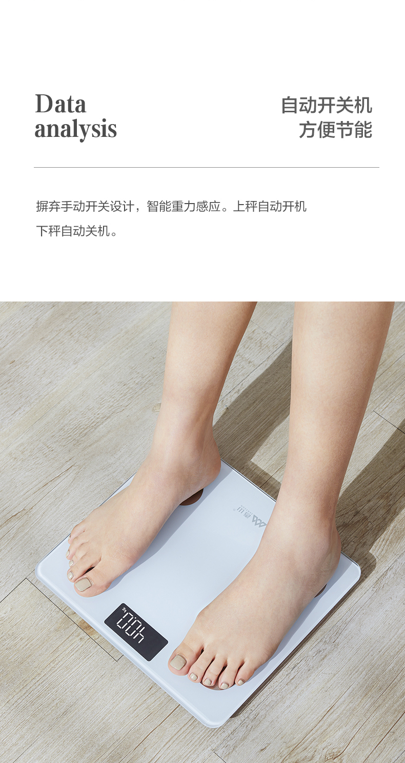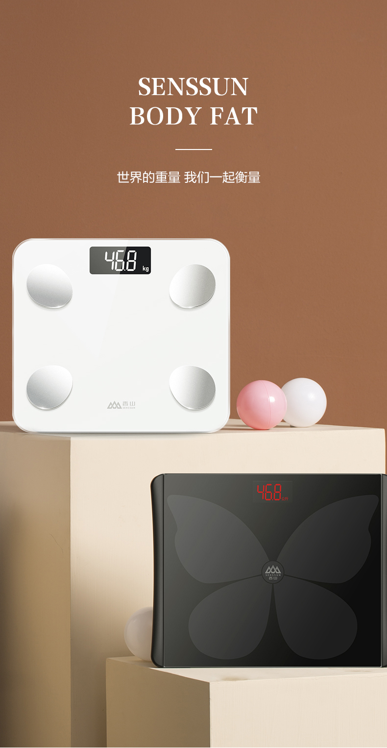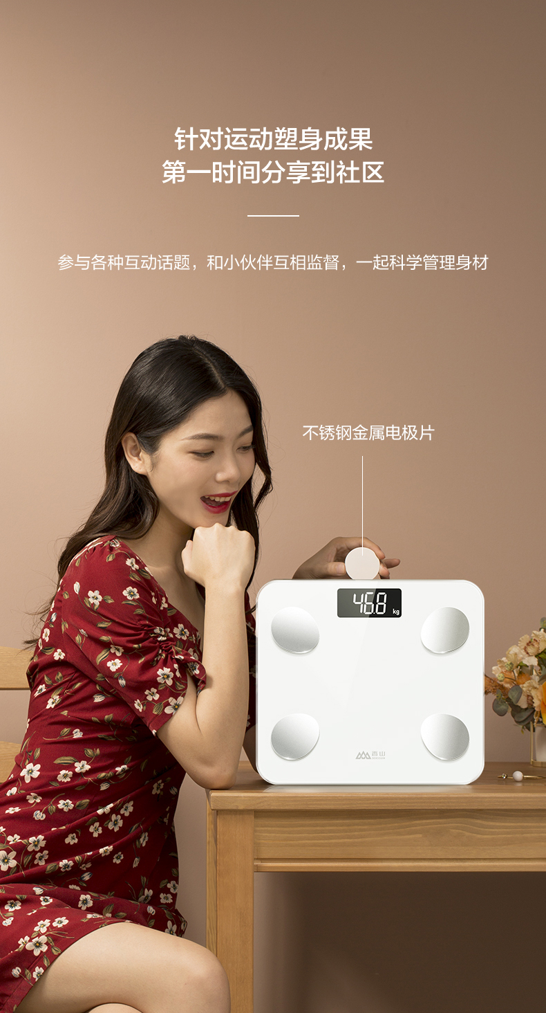 通过香山健康的APP的跟踪记录,可清楚明晰地了解到自己身体状况的变化,并且做出针对性调整。自动开关机,使用智能重力感应,上秤自动给开机,下秤自动关机。高硬度钢化玻璃表面,LED液晶显示,体重精确到0.1kg。尺寸29*26cm。