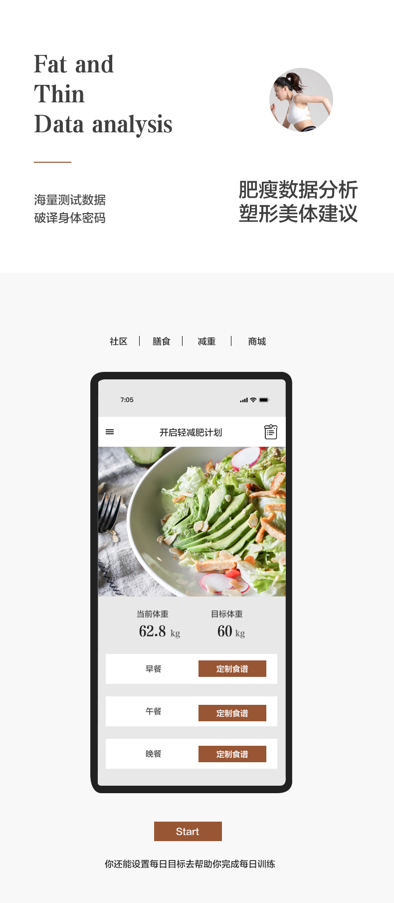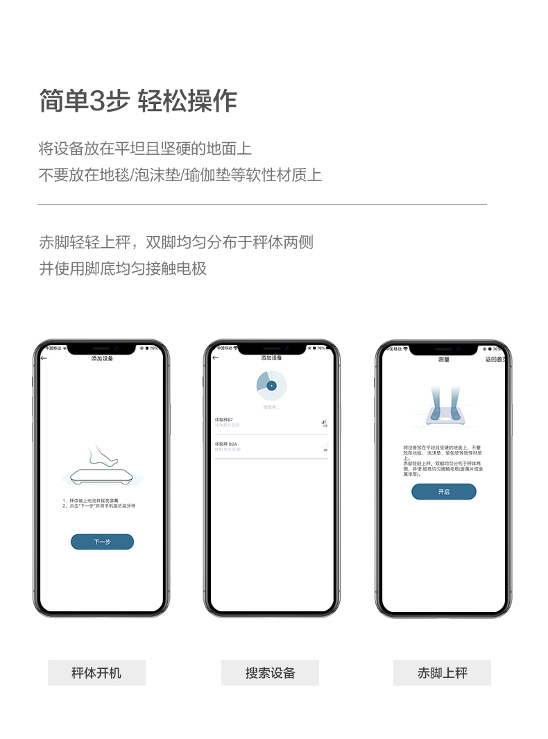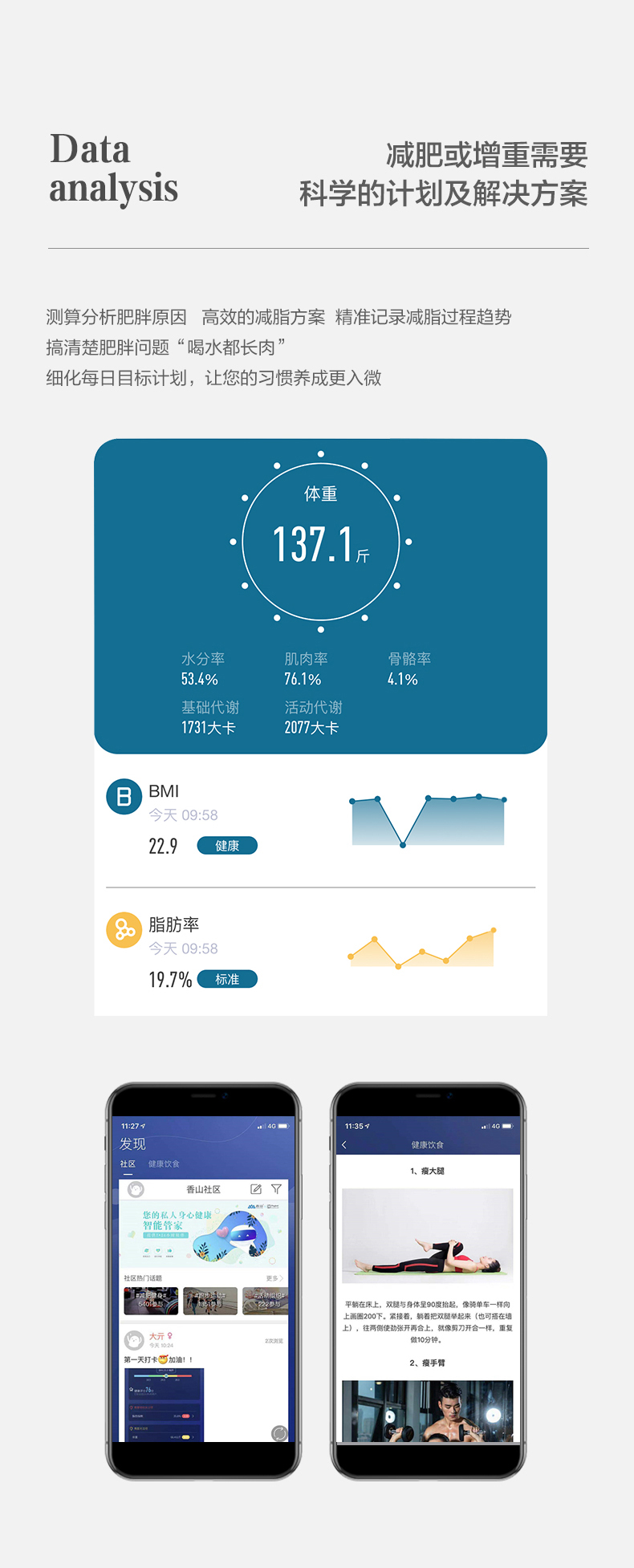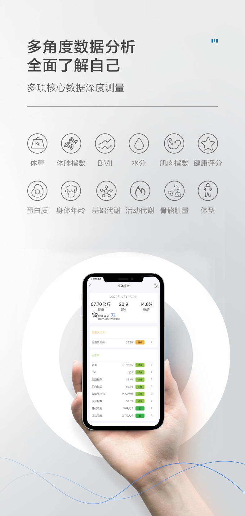 可监测12项身体数据,包括体重、体胖指数、BMI、水分、肌肉指数、蛋白质、身体年龄、基础代谢、活动代谢、骨骼肌量、体型、健康评分,在连接APP时,展现并自动分析你的数据,APP可制定你的瘦身计划和饮食规划,支持IOS和安卓。