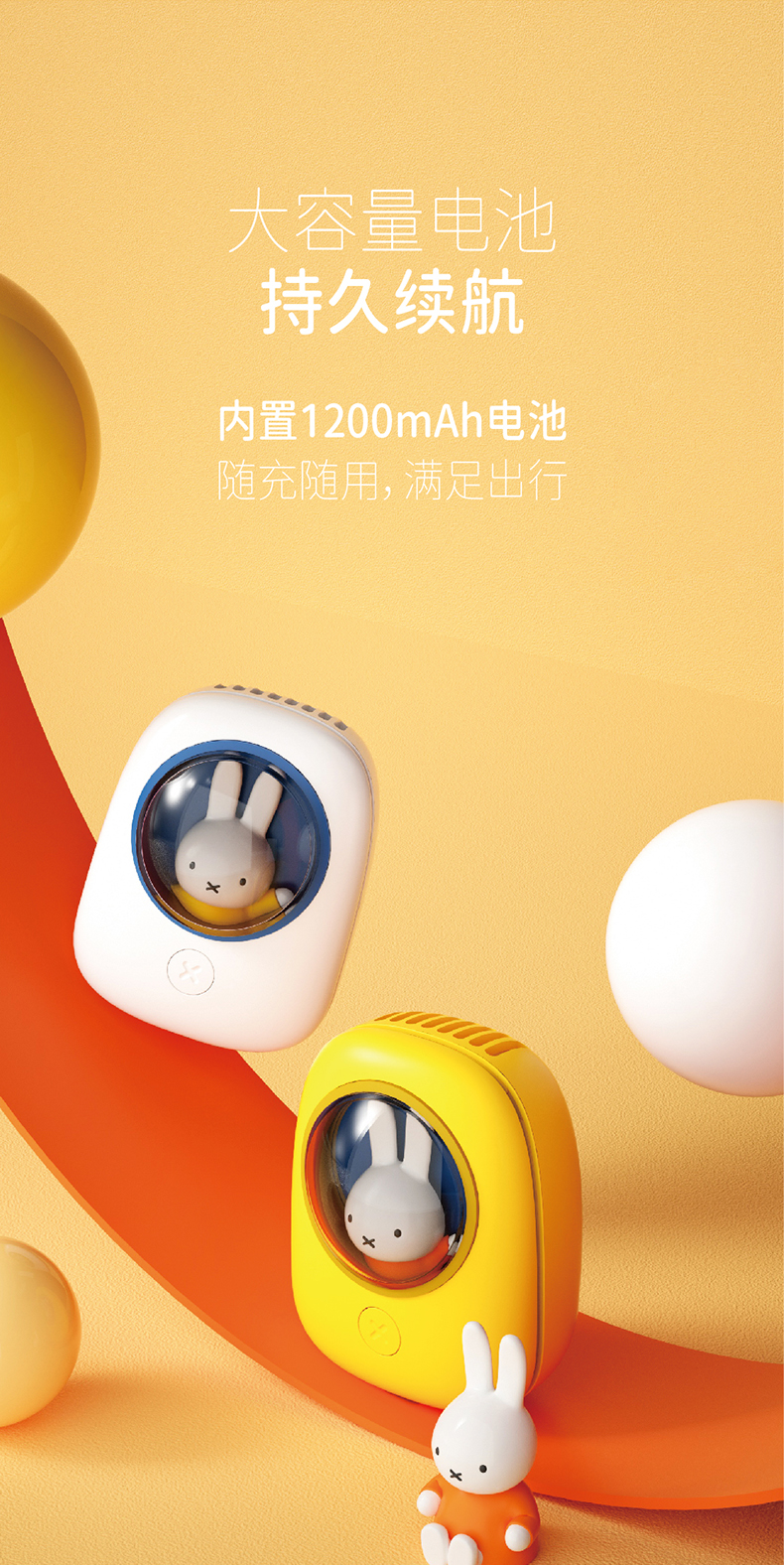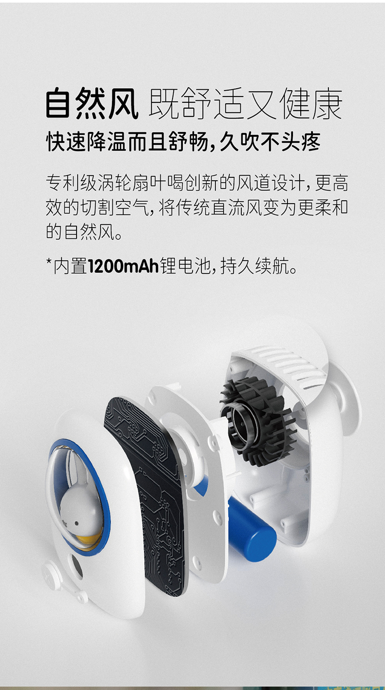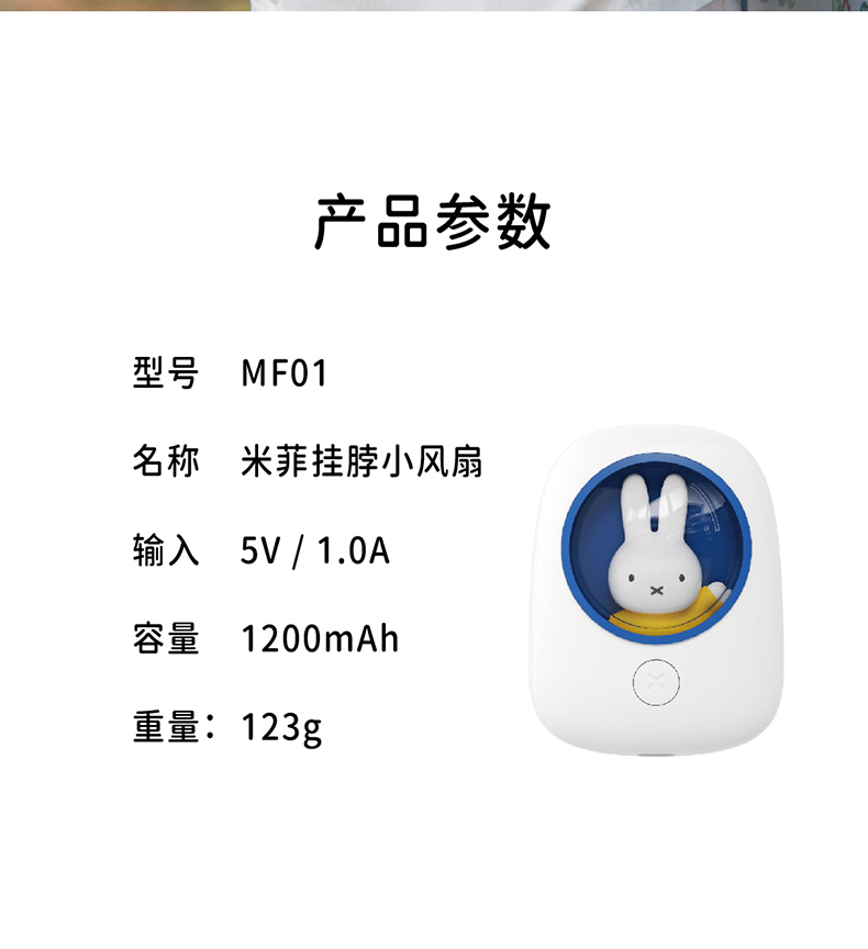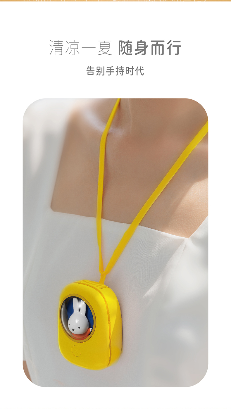 米菲正版联名款挂脖小风扇,米菲小兔坐在太空舱内,外形设计超可爱,内置1200mAh锂电池,续航持久,专利涡轮扇叶,上置出风口,将直流风转换为更加柔和的自然风,自带3档风速调节,最长可续航6小时。