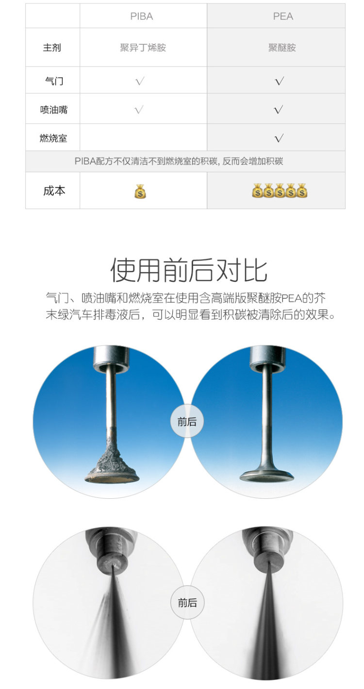 芥末绿与市面上普通的燃油添加剂相比,使用了PEA(聚醚胺),可同时清洁气门、喷油嘴和燃烧室,清洗比较彻底,同时价格也比较高,不过使用后能明显看到效果,适用于市面上全部汽油车辆(注:柴油车不能用)。