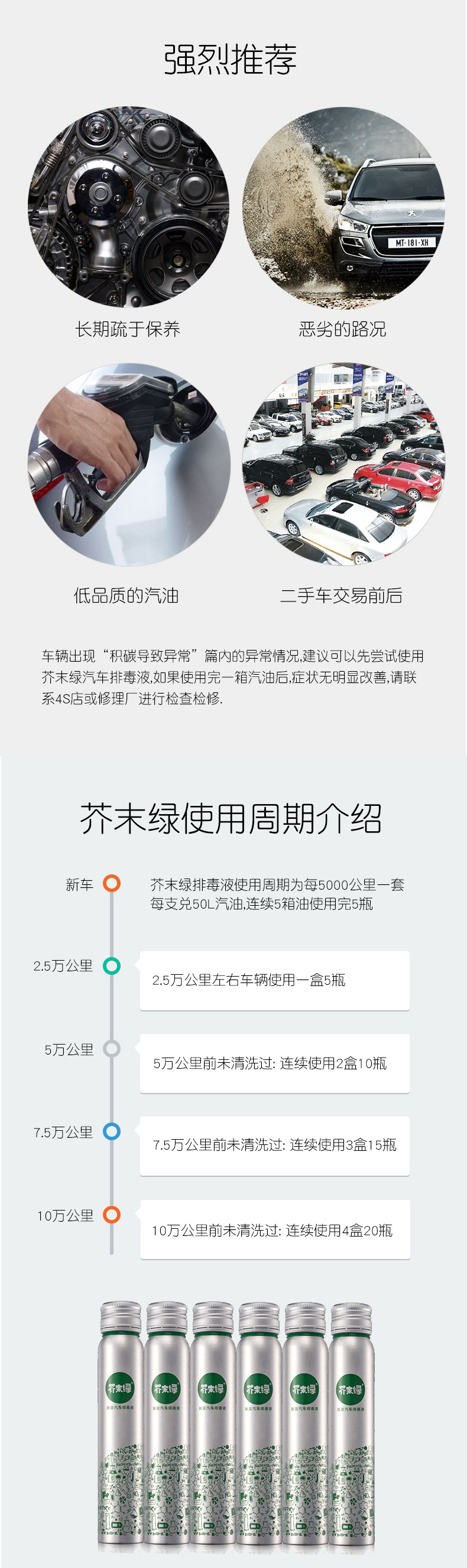 使用方法:每5000公里使用1套,1支芥末绿可以兑50升汽油。