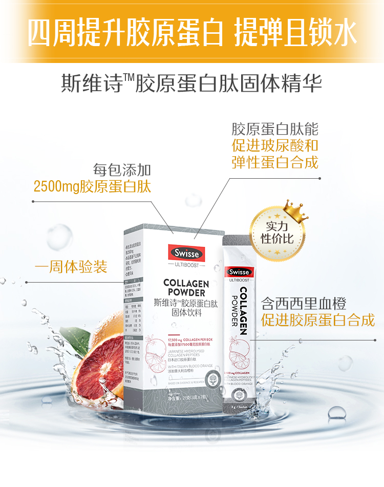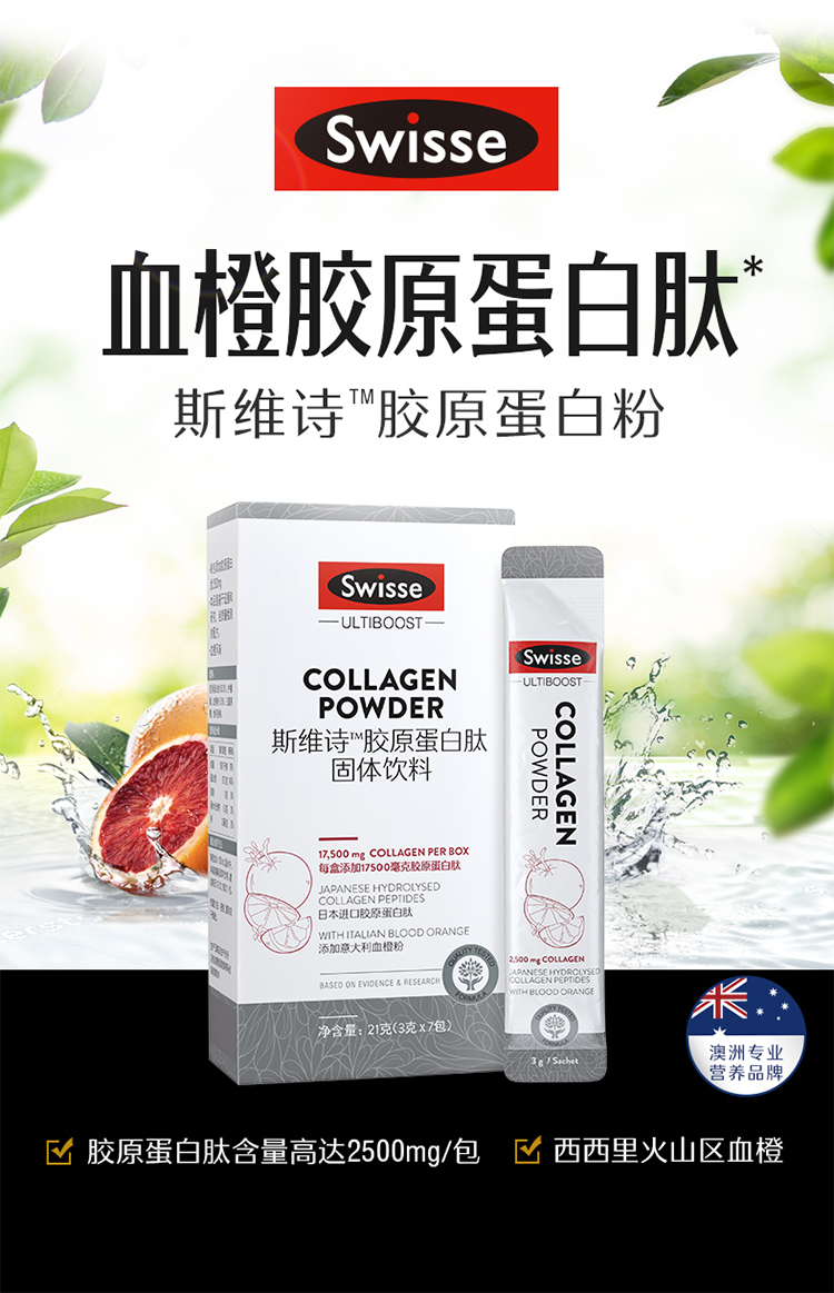这款Swisse 胶原蛋白肽固体饮料,添加西西里火山区血橙精华和日本专利活性成分Wellnex胶原蛋白肽,胶原蛋白肽含量高达2500mg/包,促进弹性蛋白、玻尿酸合成,辅助抗糖化,富含丰富维生素C和花青素,促进内源性胶原蛋白合成,帮助减少紫外线引起的肌肤损伤和老化。