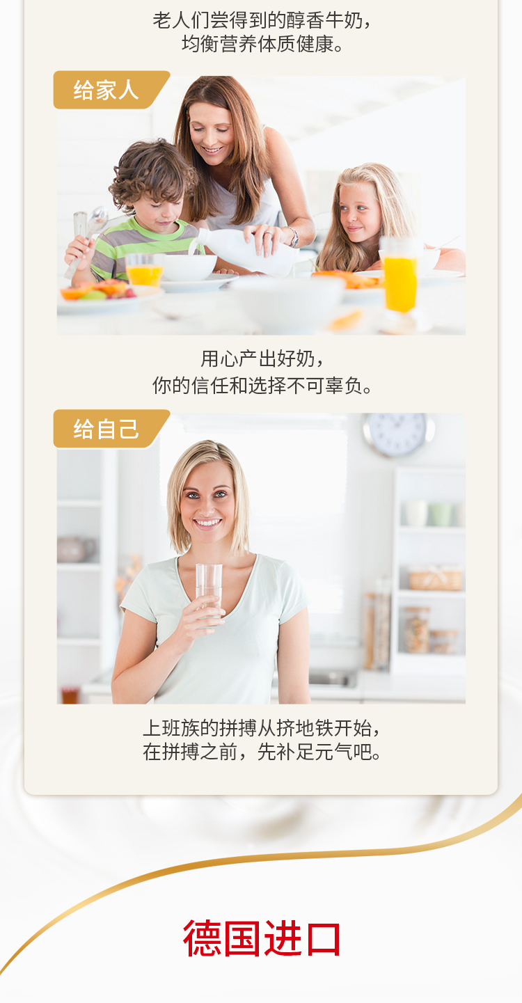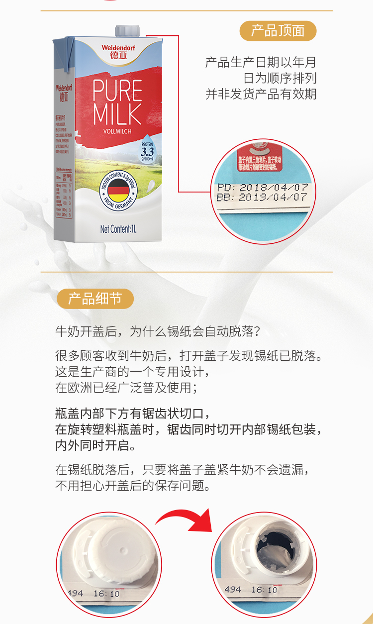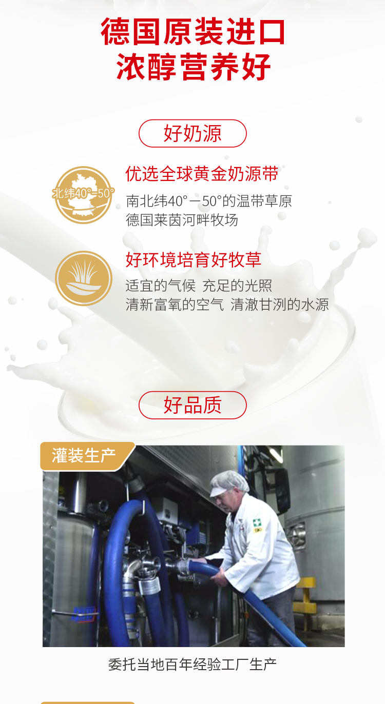德亚全脂牛奶,德国原装进口,非国内灌装。乳源来自南北纬40~50°的温带草原德国莱茵河畔牧场里的奶牛,100ml奶中的乳蛋白含量达到了3.3g,很多国产牛奶都是3.2g。