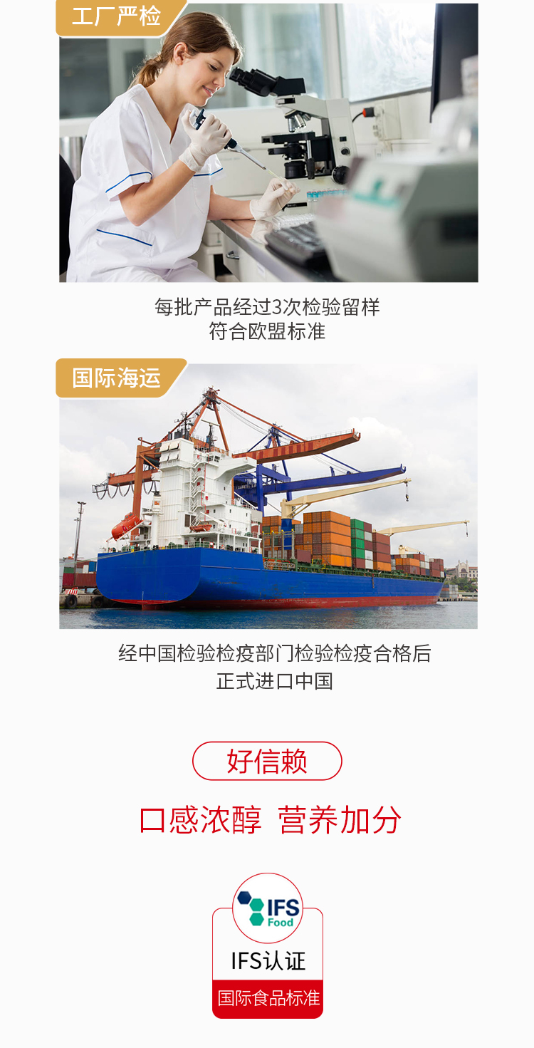 德亚牛奶由德国知名奶产品厂商Hochwald 好沃德代工生产,商品拥有国家颁发的“出入境检验检疫卫生证书”和“中国人民共和国进口货物报关单”。