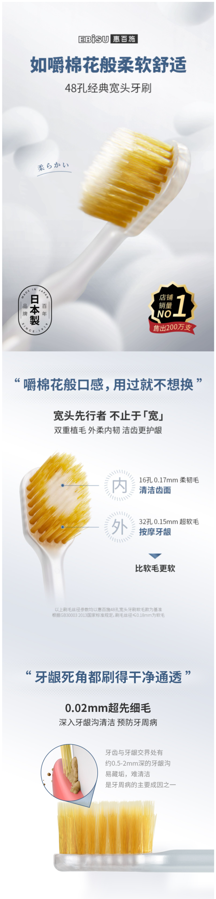 这款牙刷48孔大宽头设计,毛孔数是普通刷头的1.8倍,能大面积的覆盖上下牙齿和牙龈,双层不同柔软度的刷毛设计,柔与力兼施,清洁与按摩兼备,呵护娇嫩牙龈。同时也是平尖两种刷毛的组合,丝径20微米的「超纤细尖毛」,能深入清洁牙龈沟,「平切毛」能清洁齿面色渍和污垢。