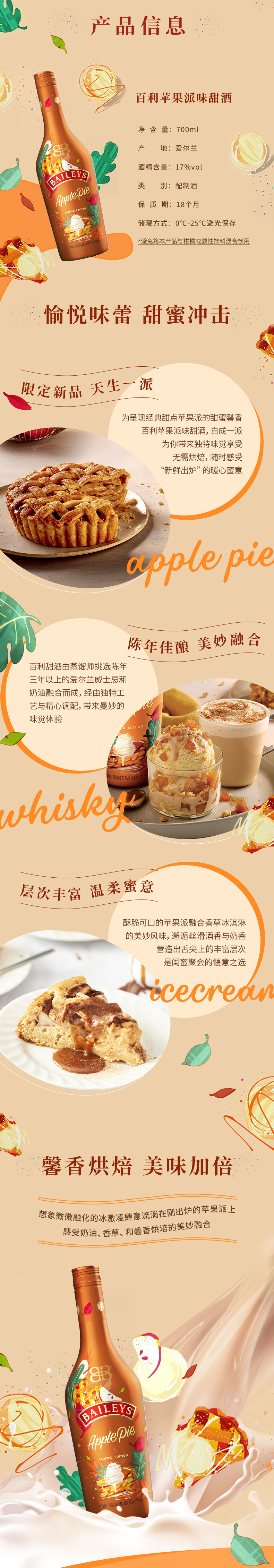 BAILEYS 百利甜酒 苹果派味,百利甜酒由蒸馏师挑选陈年,三年以上的爱尔兰威士忌和奶油融合而成,经由独特工,艺与精心调配,带来曼妙的,味觉体验。为呈现经典甜点苹果派的甜蜜馨香,百利苹果派味甜酒,自成一派,为你带来独特味觉享受,无需烘焙,随时感受,“新鲜出炉”的暖心蜜意。