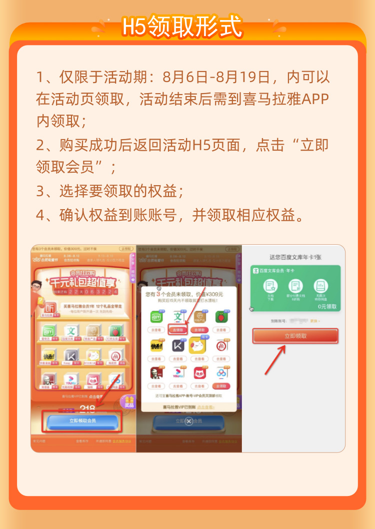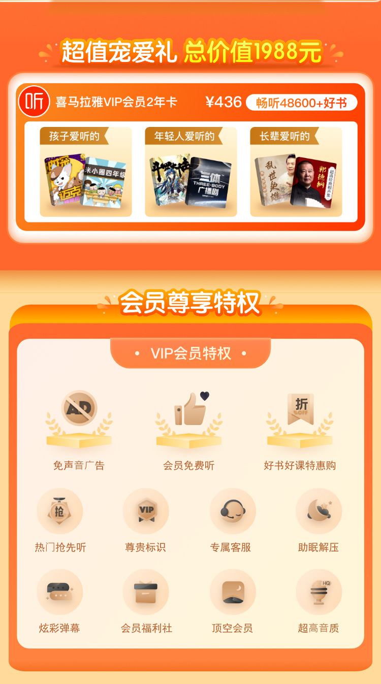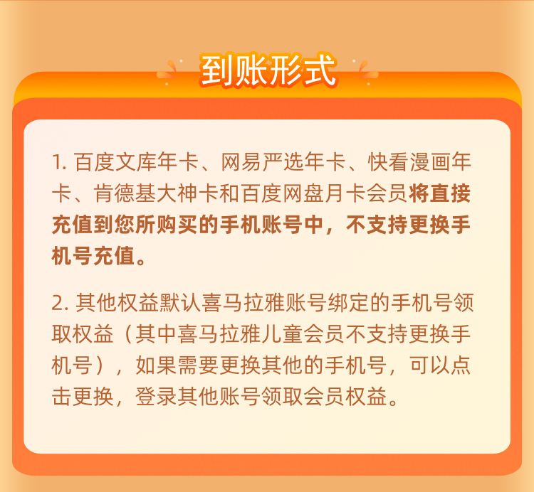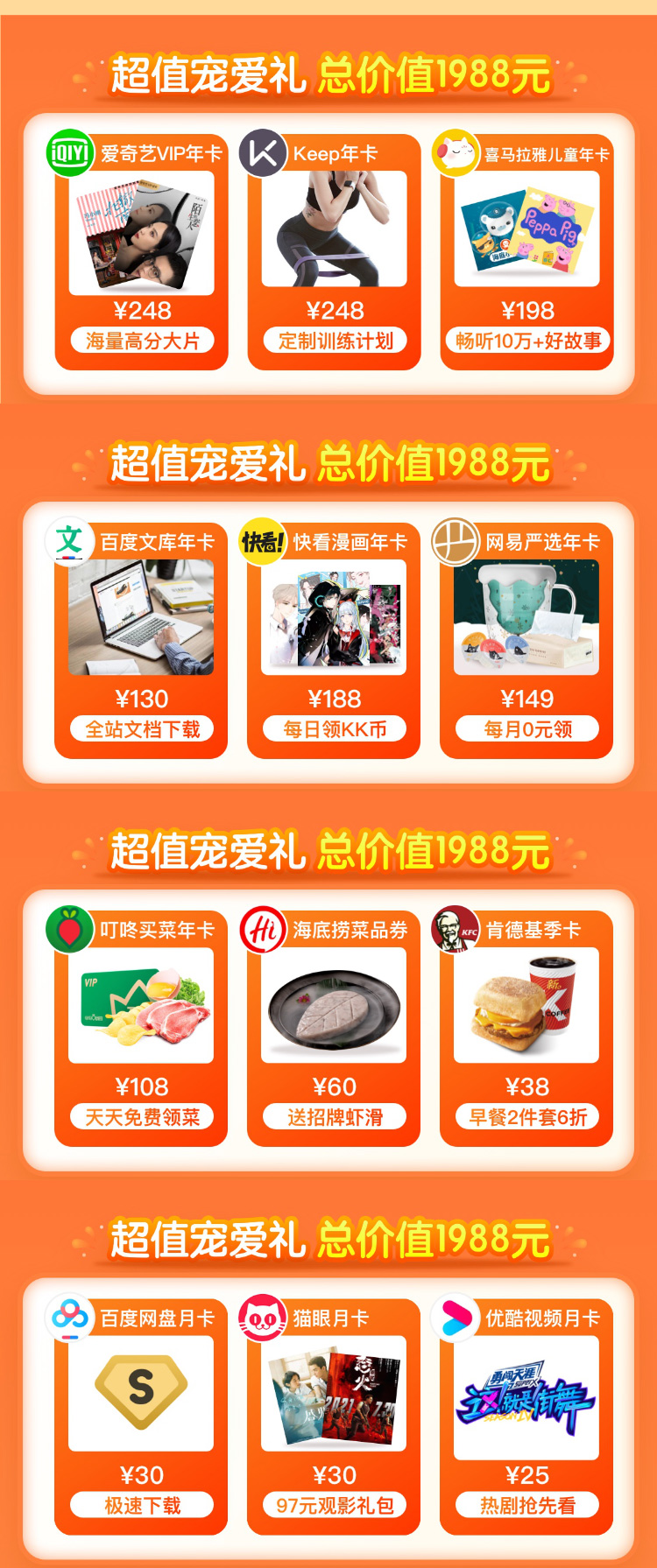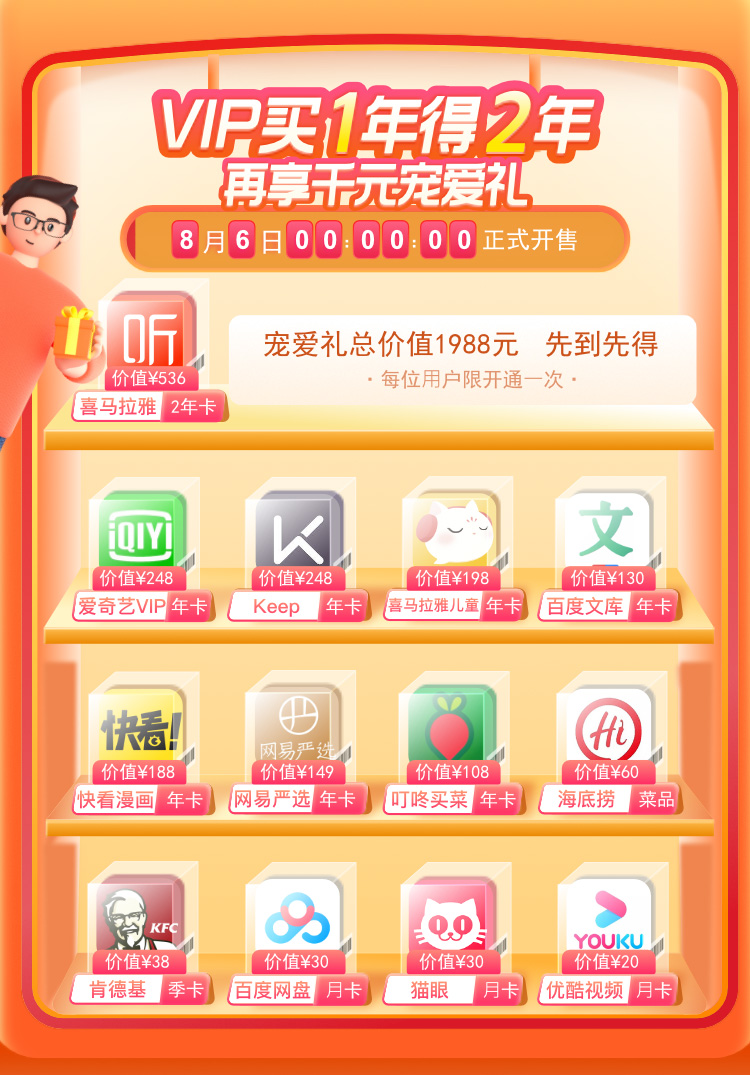 年卡会员(8家):喜马拉雅巅峰会员2年卡;爱奇艺黄金VIP年卡;keep会员年卡;喜马拉雅儿童会员年卡;百度文库会员年卡;网易严选pro会员年卡;快看漫画会员年卡;叮咚买菜会员年卡;