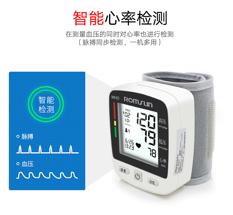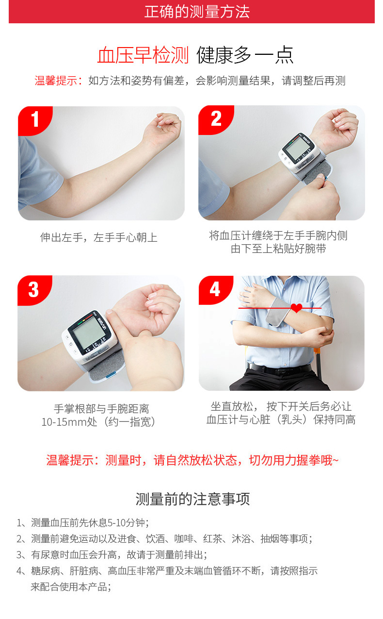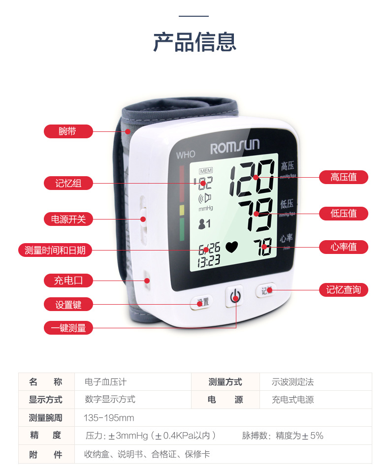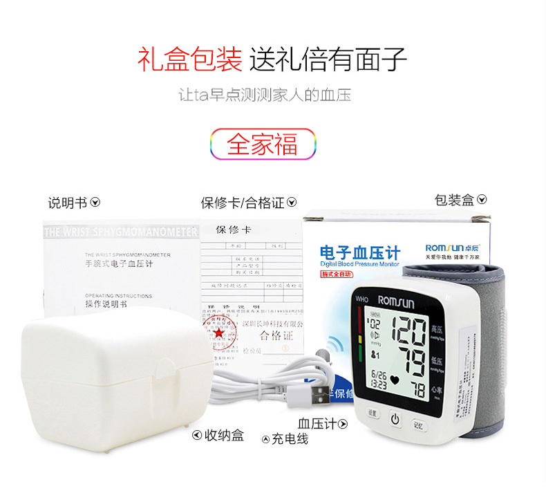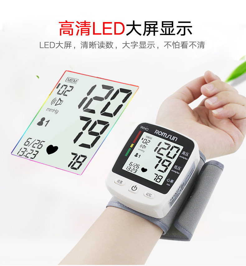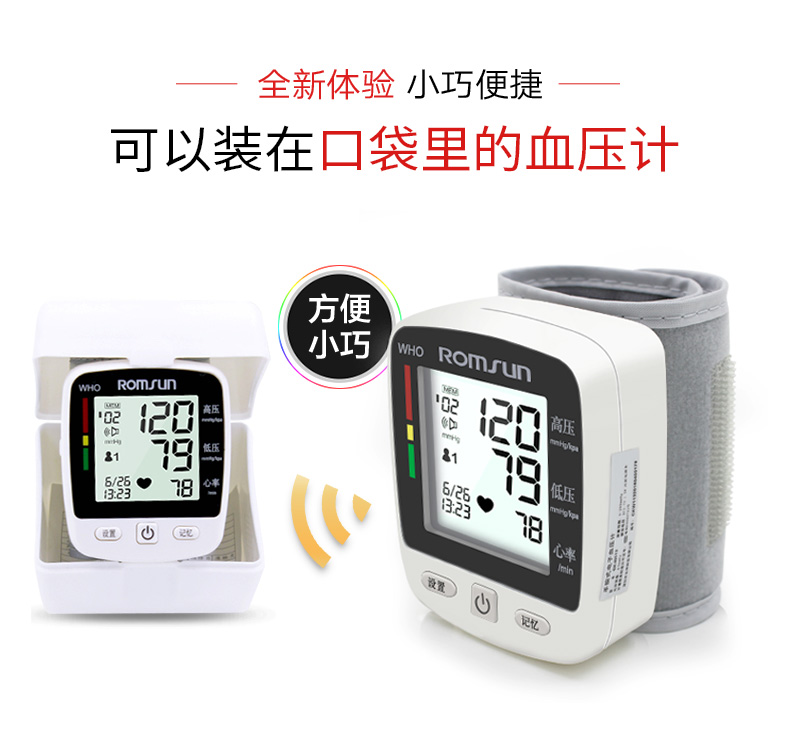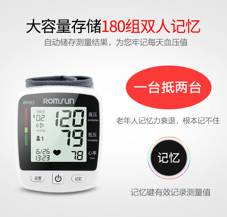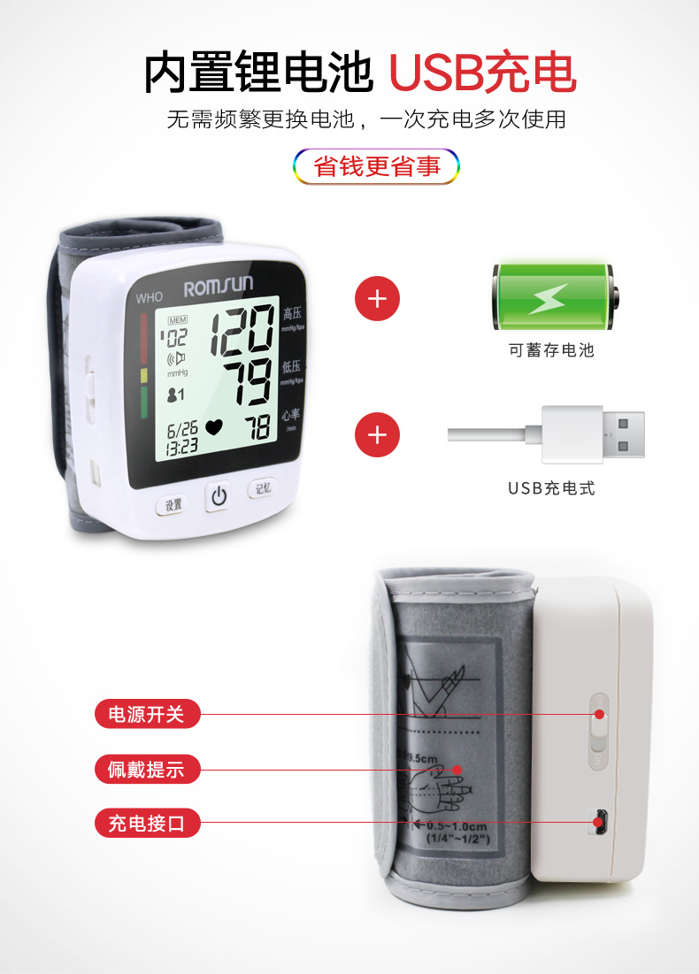 此外,还有90组的双人记忆空间,方便查询以往的数据。内置锂电池,USB充电,充电2小时,可用2个月。小巧便携,方便携带,随时随地都可以测量血压。