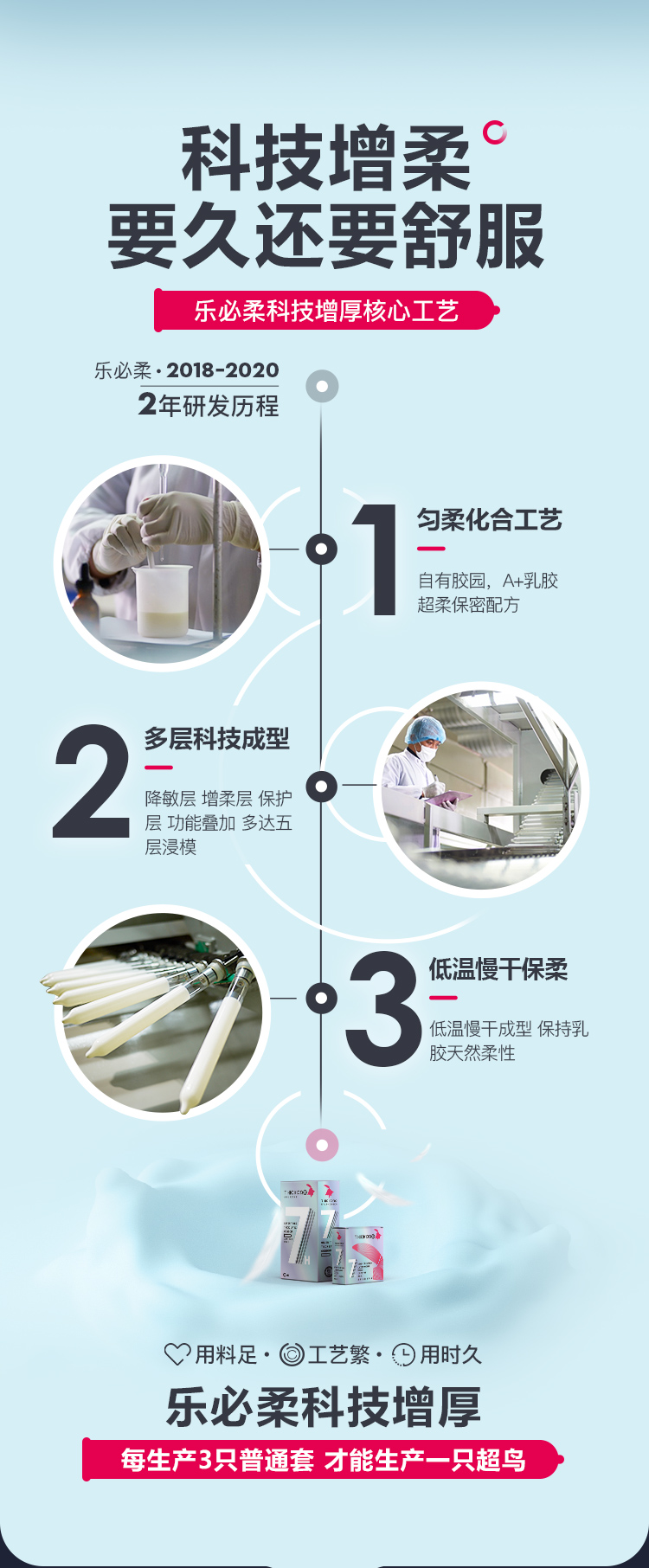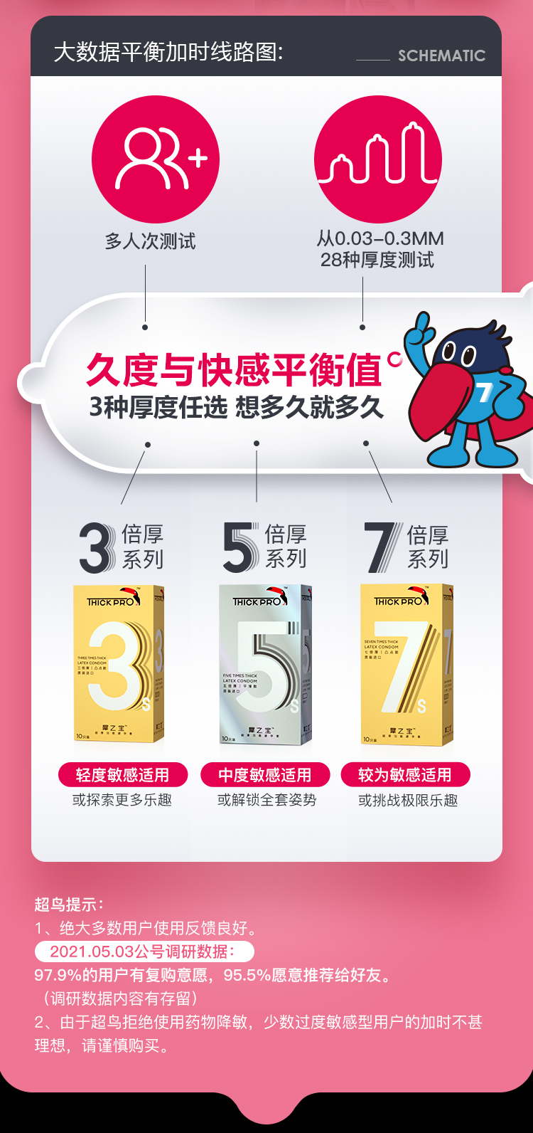 超鸟THICKPRO,是一款主打超厚功能避孕套的两性健康品牌,2013年开始产品研发筹划,历经7年,于2021年面世。联合马来西亚康乐(Karex)公司,经过3年多时间,研发出乐必柔生产工艺,借助原料优势和创新工艺使避孕套拥有柔软触感,使避孕套增厚又不损失快感。